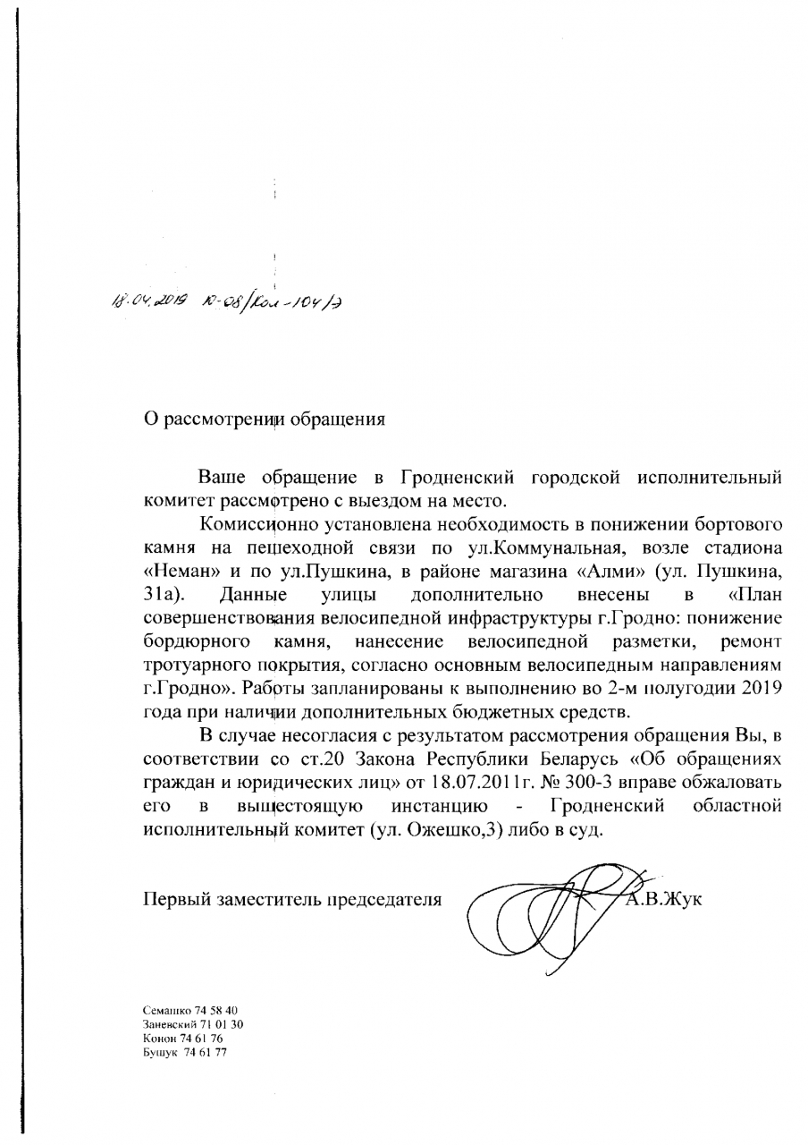 В соответствии с требованиями п. 5.4.8 ТКП 45-3.03-227-2010 “Улицы населённых пунктов”, на основании ст. 41 Закона «О местном управлении и самоуправлении», которая устанавливает, что исполкомы организуют строительство, реконструкцию, ремонт и содержание местных автомобильных дорог, управляют дорожной деятельностью, прошу уменьшить высоту бортового камня (бордюра) на пешеходной связи по улице Пушкина, в районе магазина "Алми" (ул. Пушкина 31а) в городе Гродно для обеспечения удобства передвижения пешеходов, велосипедистов и людей с ограниченными возможностями (инвалидов-колясочников).