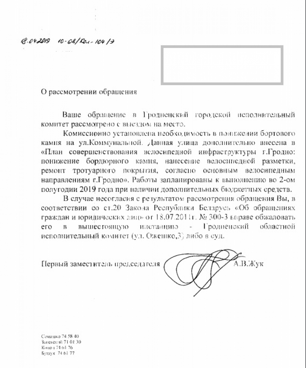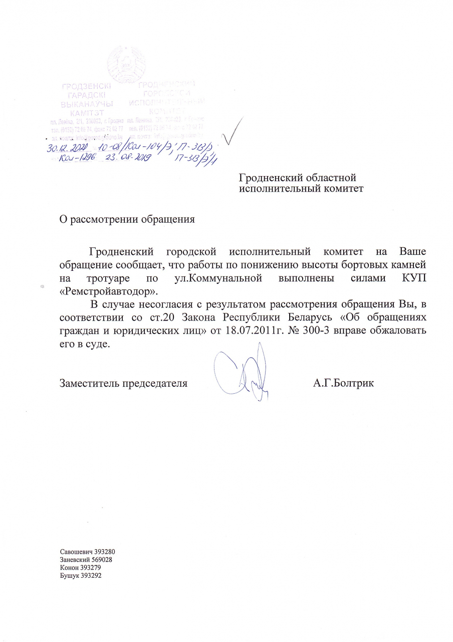В соответствии с требованиями п. 5.4.8 ТКП 45-3.03-227-2010 “Улицы населённых пунктов”, на основании ст. 41 Закона «О местном управлении и самоуправлении», которая устанавливает, что исполкомы организуют строительство, реконструкцию, ремонт и содержание местных автомобильных дорог, управляют дорожной деятельностью, прошу уменьшить высоту бортового камня (бордюра) на пешеходной связи по улице Коммунальная, возле стадиона "Неман" в городе Гродно для обеспечения удобства передвижения пешеходов, велосипедистов и людей с ограниченными возможностями (инвалидов-колясочников).