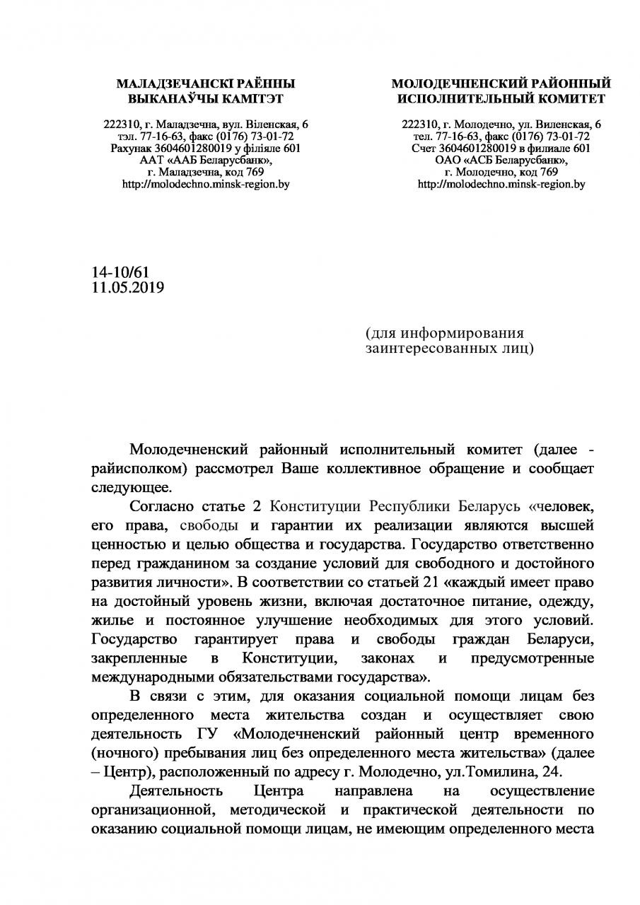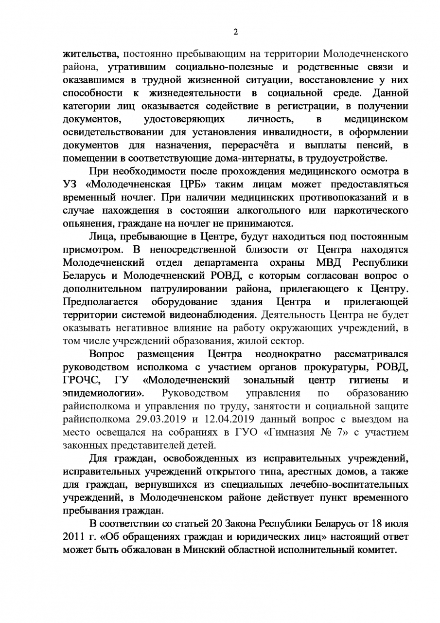 Мы, нижеподписавшиеся, в защиту прав, свобод и законных интересов детей и несовершеннолетних, выражаем свою озабоченность фактическим местоположением открытого ГУ «Молодечненский районный центр временного (ночного) пребывания лиц без определенного места жительства» (далее – Центр), которое размещено по адресу: г. Молодечно, ул. Томилина, 24.