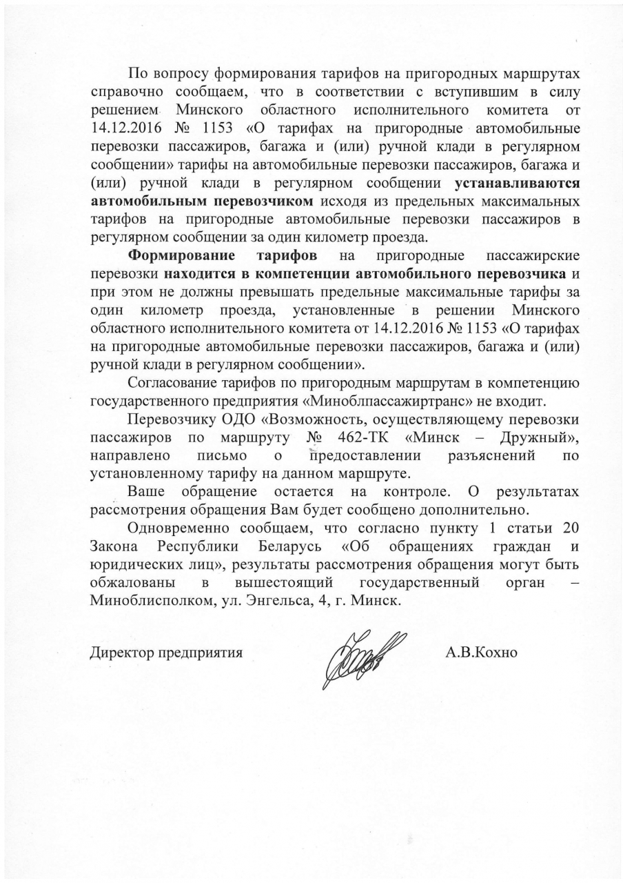 Перевозчику, осуществляющему перевозки пассажиров по маршруту №462-ТК "Минск-Дружный", направлено письмо о предоставлении разъяснений по установленному тарифу на данном маршруте.