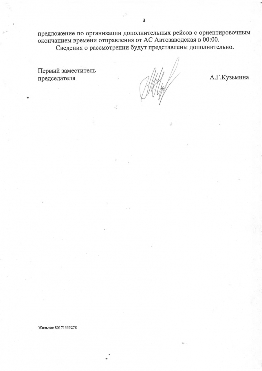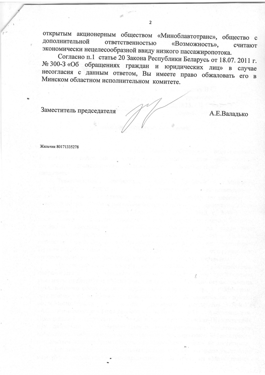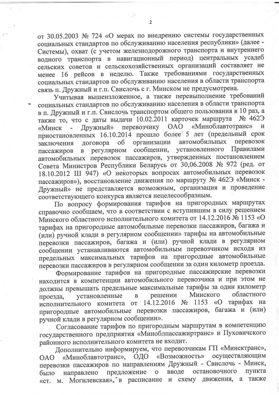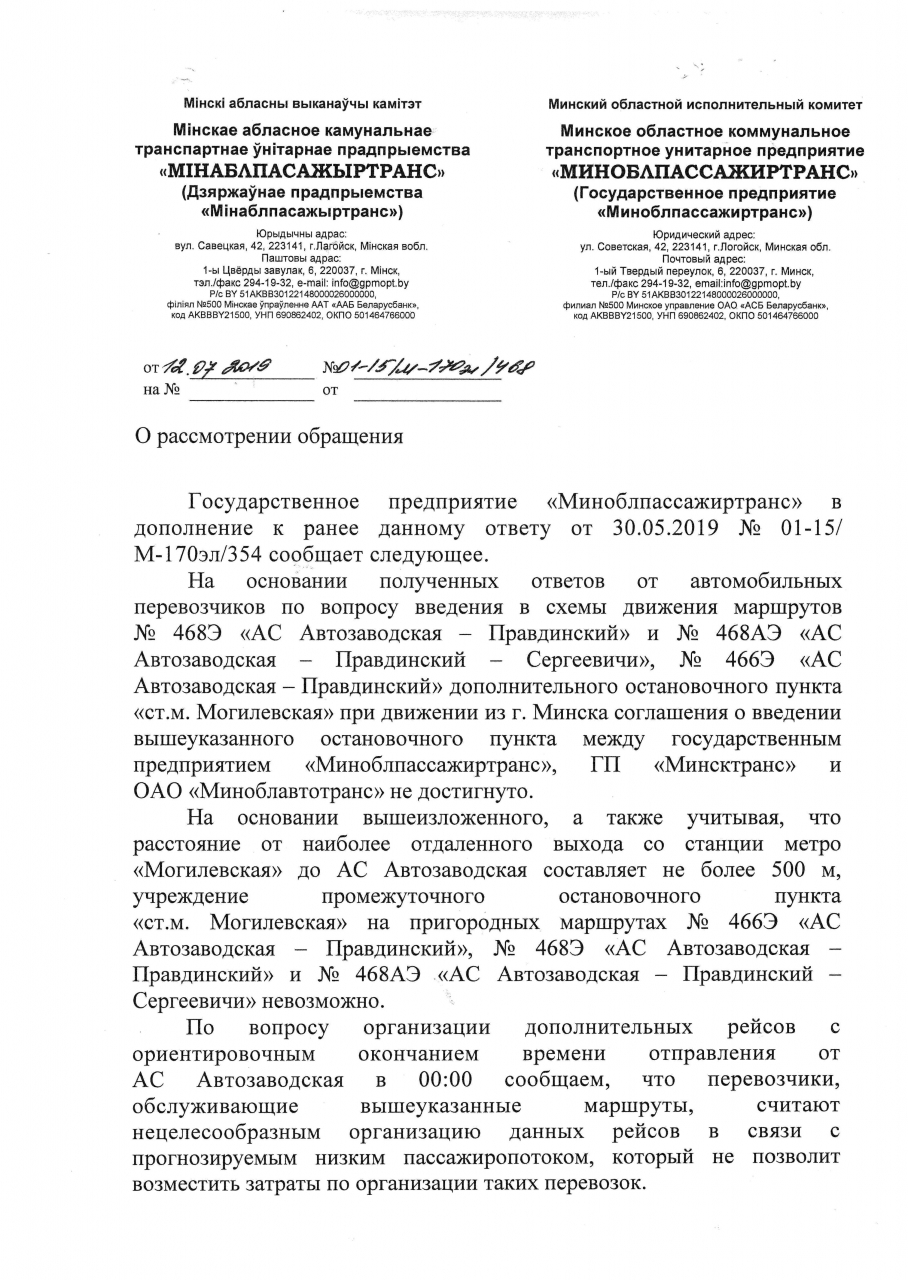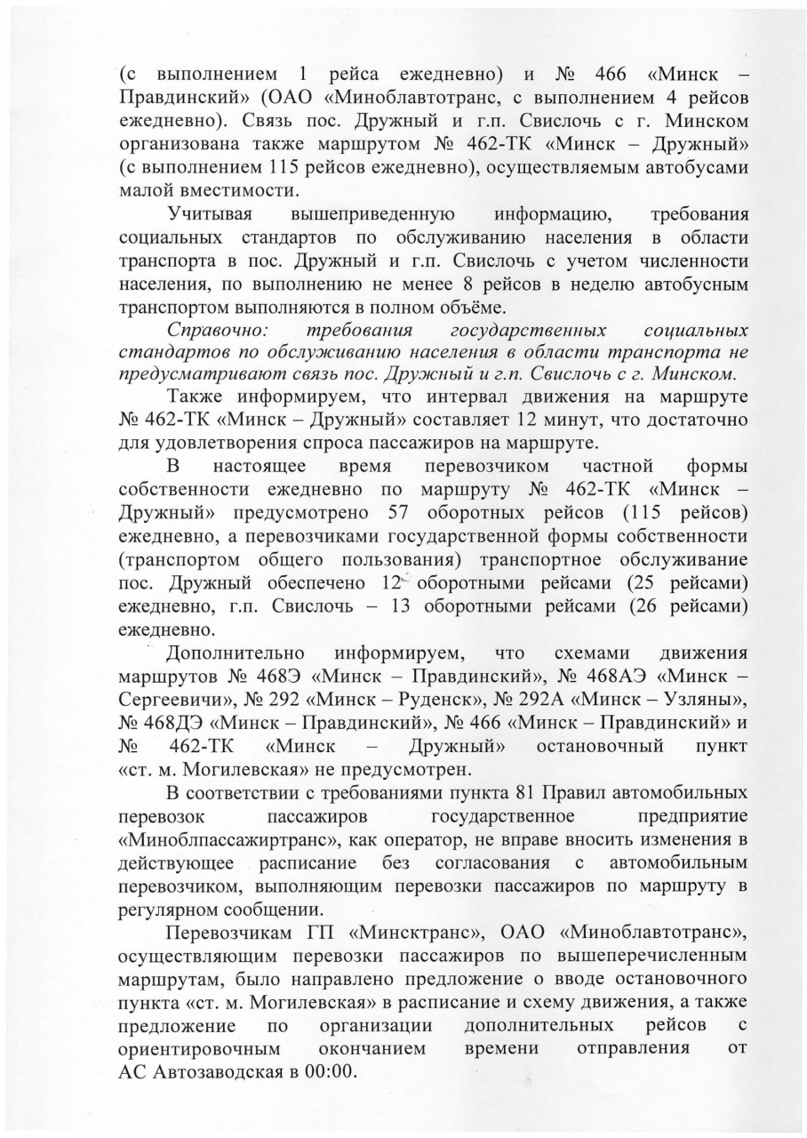 На основании ст. 41 Закона «О местном управлении и самоуправлении», которая устанавливает, что исполкомы создают условия для предоставления транспортных услуг населению и организуют транспортное обслуживание граждан на соответствующей территории, просим пустить автобус между нашими населёнными пунктами и Минском с интервалом между рейсами 30 минут, в часы пик 15 минут, обязательной остановкой на ст. Могилёвская (при следовании в Дружный), и последним рейсом из Минска в 00:00.