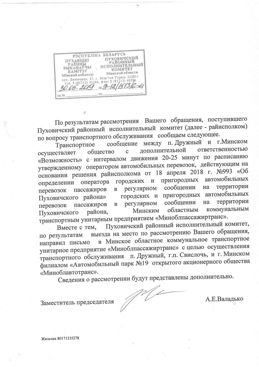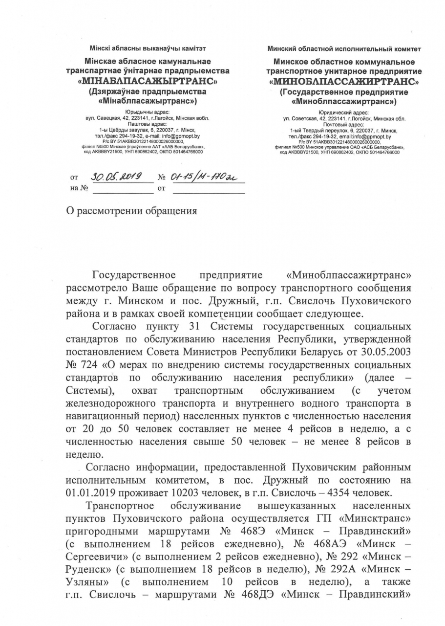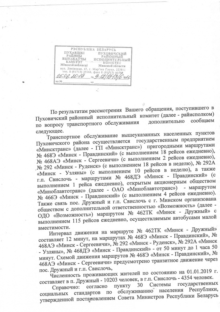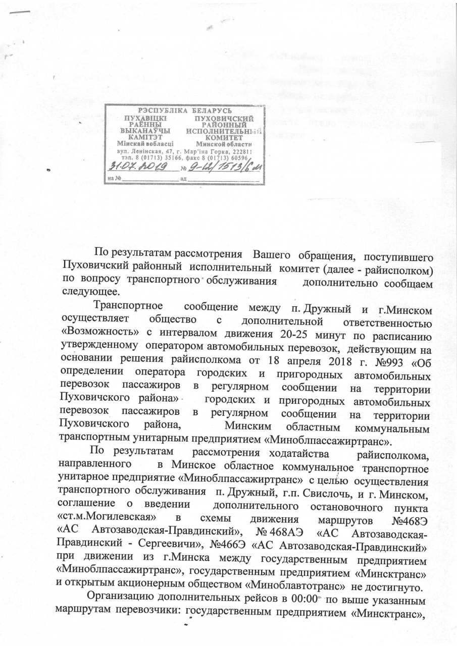 Пуховичский райисполком направил письмо в УП "Миноблпассажиртранс" с целью осуществления транспортного обслуживания п.Дружный, гп Свислочь и Минска филиалом "Автомобильный парк №19" ОАО "Миноблавтотранс".
