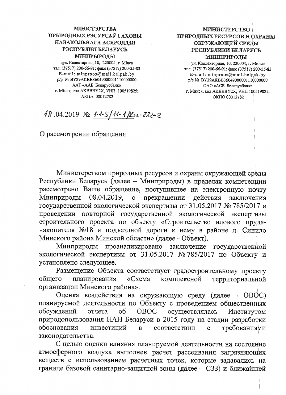 1. Прекратить действие экологической экспертизы по проекту «Строительство илового пруда-накопителя №18, расположенного в р-не д. Синило Минского района» на основании описанного выше «выявления факта представления недостоверных исходных данных на проектирование».