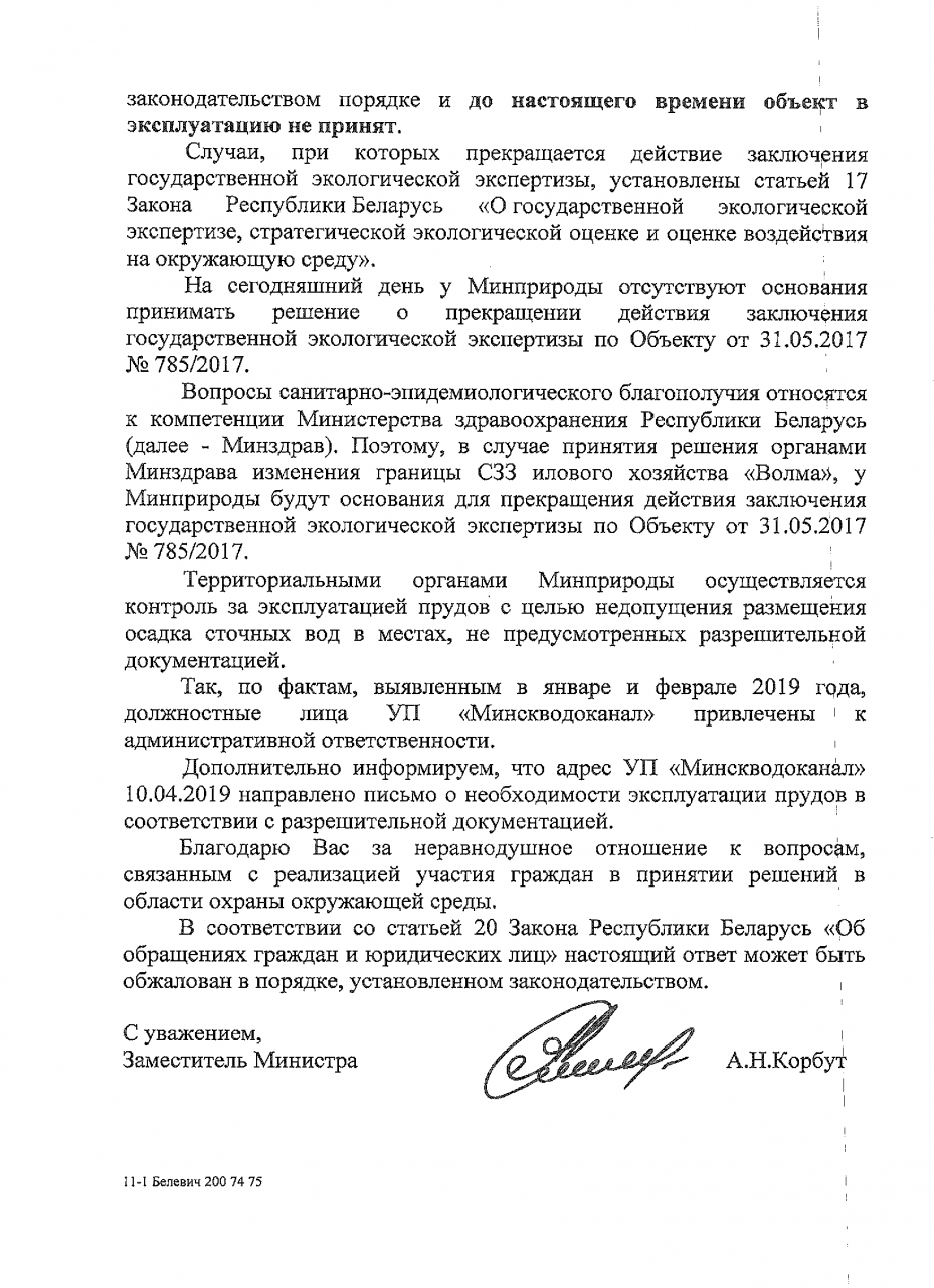 Территориальными органами Минприроды осуществляется контроль за эксплуатацией прудов с целью недопущения размещения осадка сточных вод в непредусмотренных местах. На сегодняшний день у Минприроды отсутствуют основания принимать решения о прекращении действия заключения гос.экологической экспертизы по объекту, указанному в обращении. В адрес УП "Минскводоканал" направлено письмо о необходимости эксплуатации прудов в соответствии с разрешительной документацией.