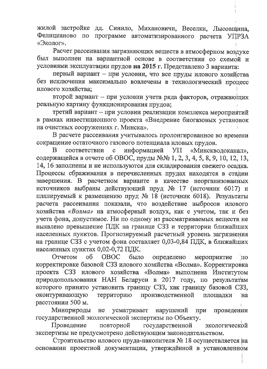 Выходит, когда проектировался 18 пруд, УП «Минсководоканал» утверждало, что для слива используется только пруд номер 17 и соответственно выбросы вредных веществ есть только от него. Но на сегодняшний день УП «Минсководоканал» уже сам официально изменил эти правила!