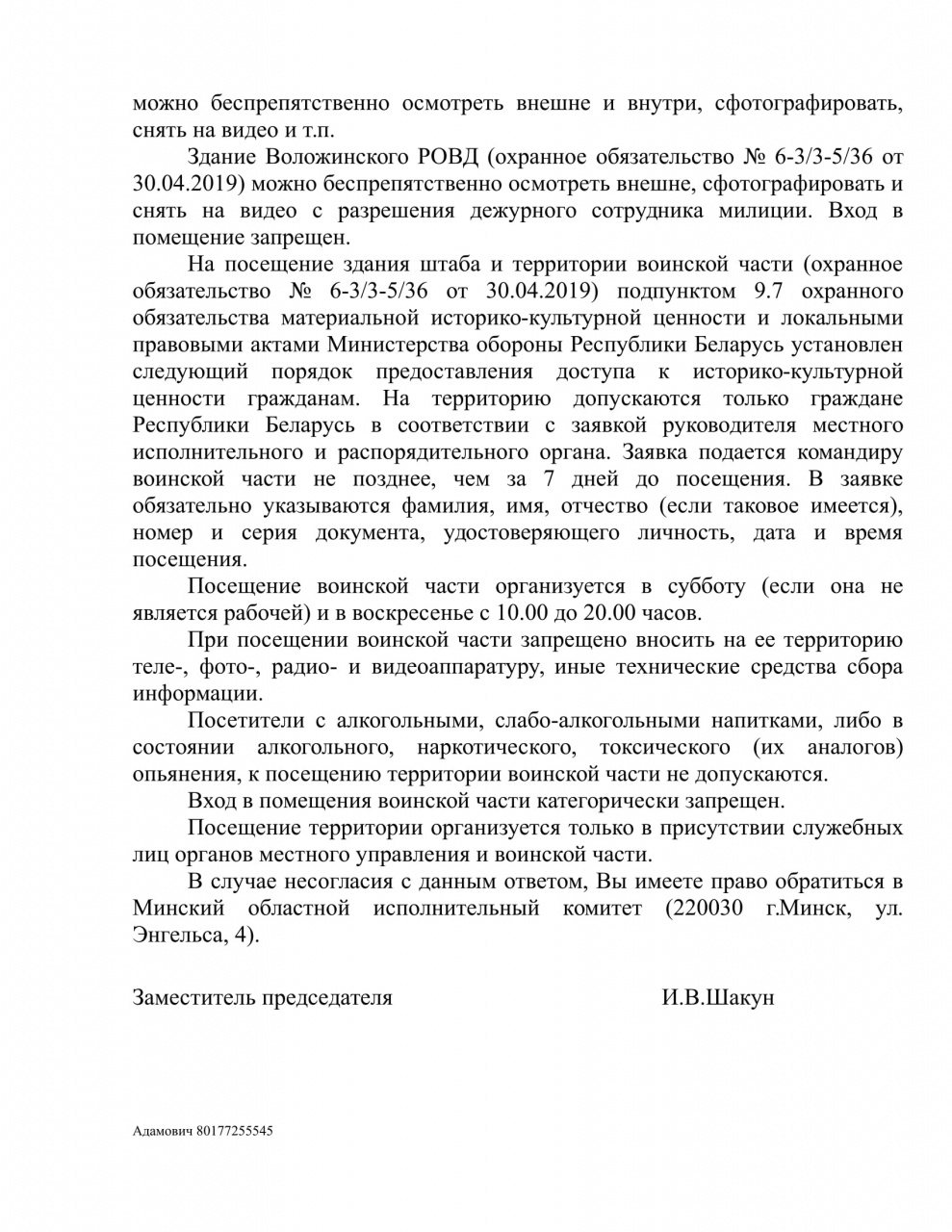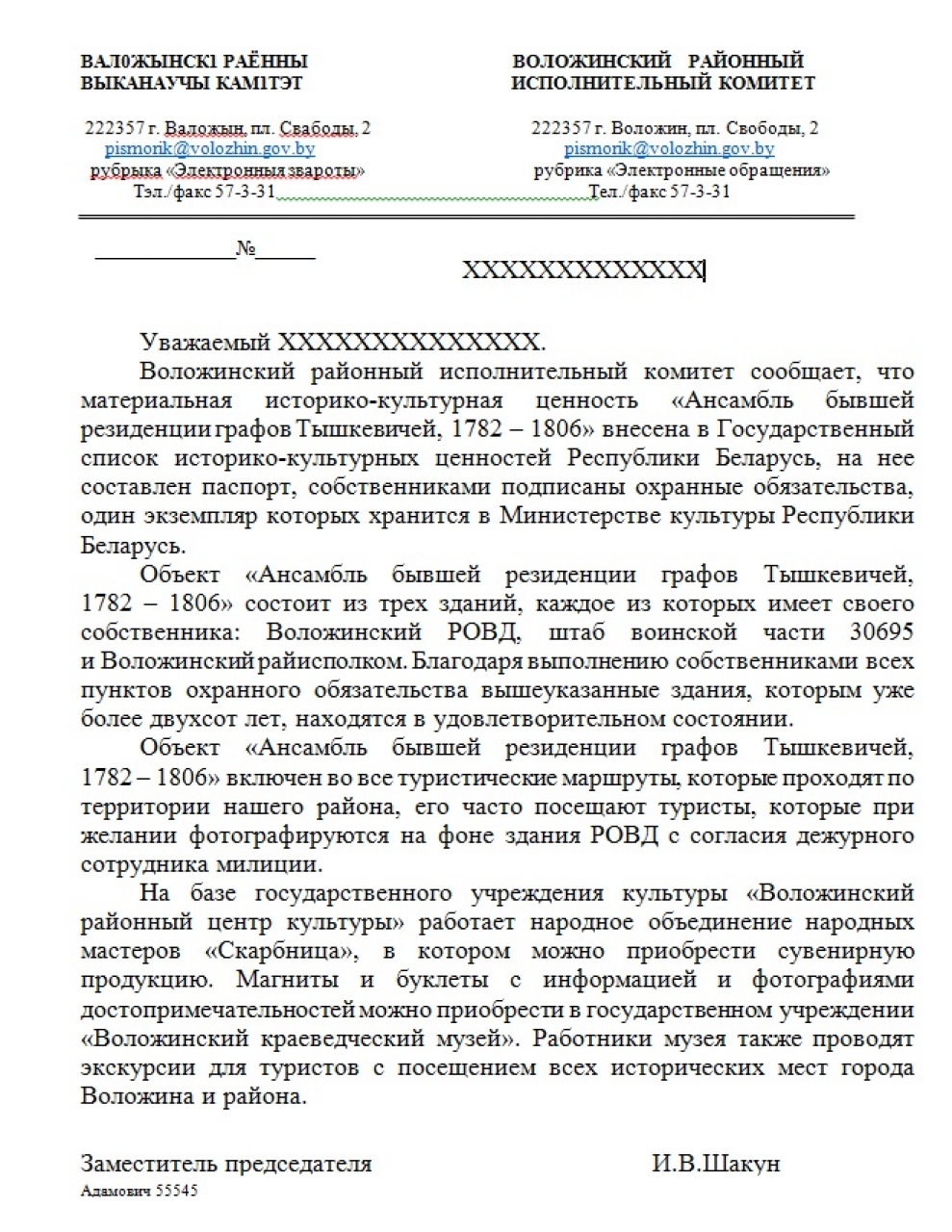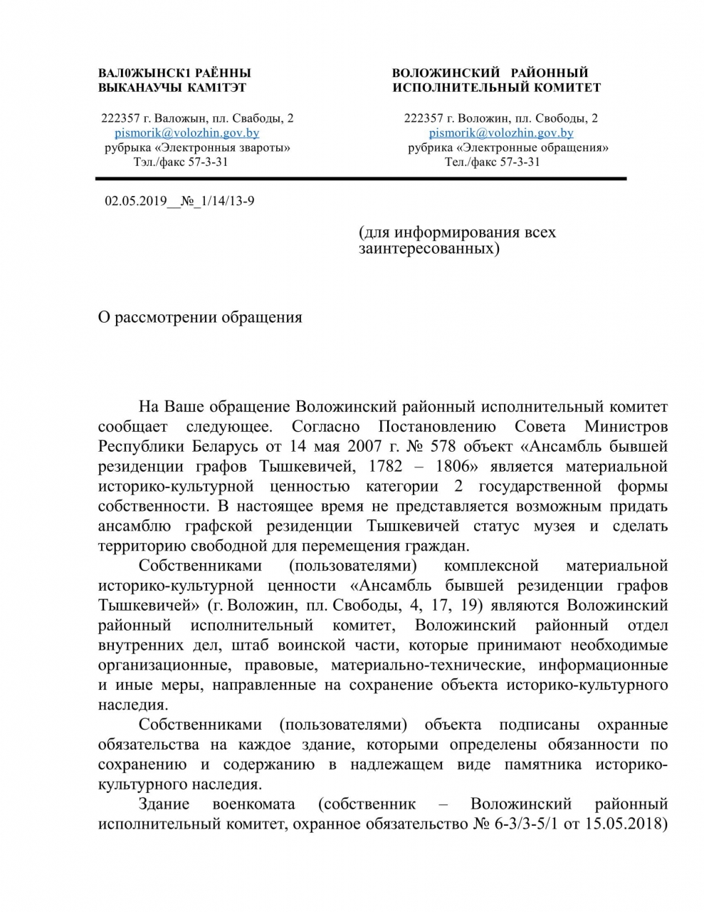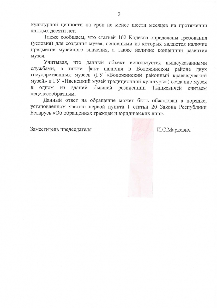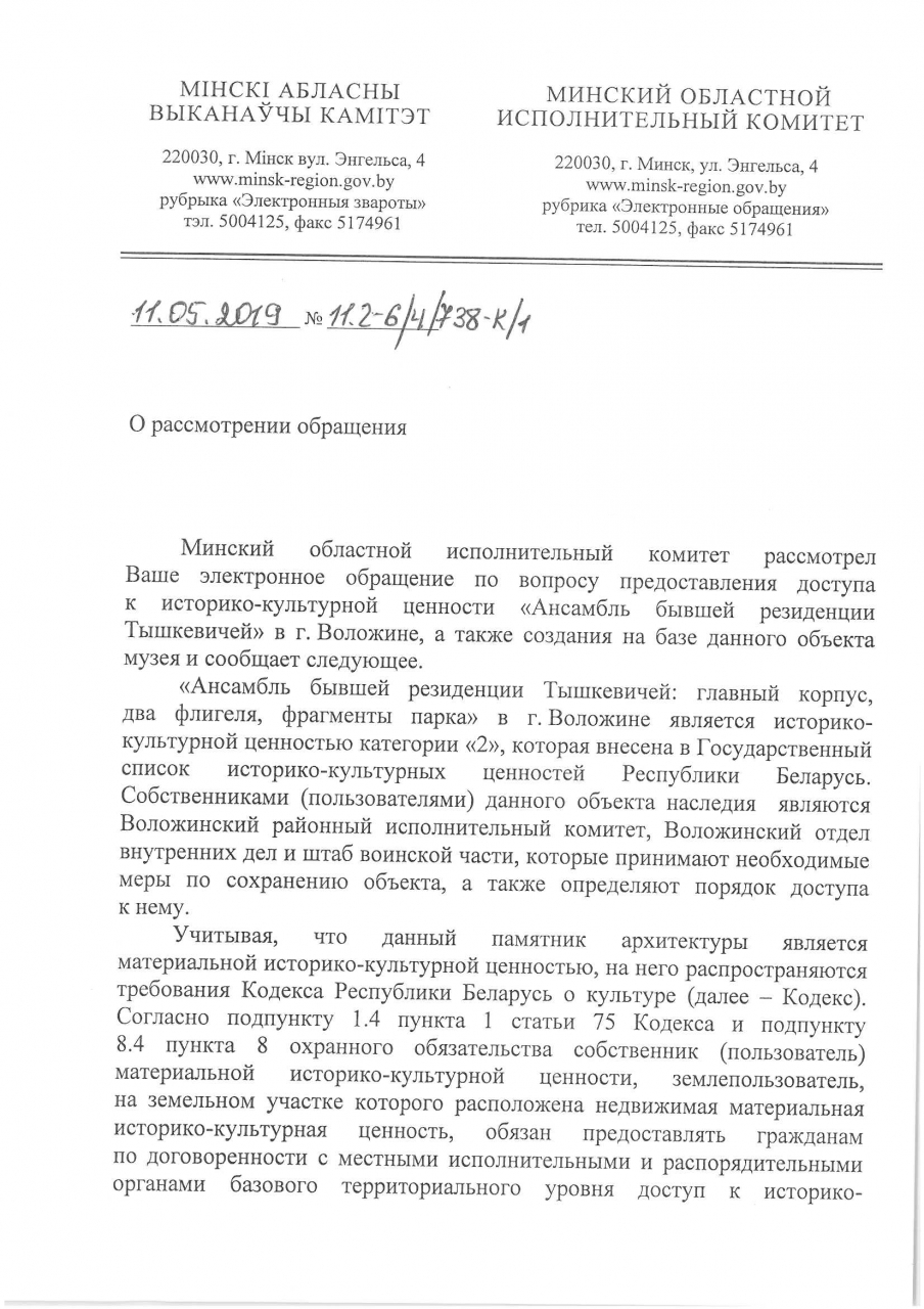 Полагаем при рассмотрении обращения о предоставлении доступа к историко-культурной ценности "Дворцово-парковый ансамбль Тышкевичей" туристам и местным жителям, Воложинский райисполком в своём ответе не учёл всех обстоятельств, описаных в обращении и подтверждающих важность свободного доступа к данному объекту, и как следствие выразил нежелание использовать вышеуказанную достопримечательность более рационально. Спасибо, что занесли только сейчас этот ансамбль в список историко-культурных ценностей.