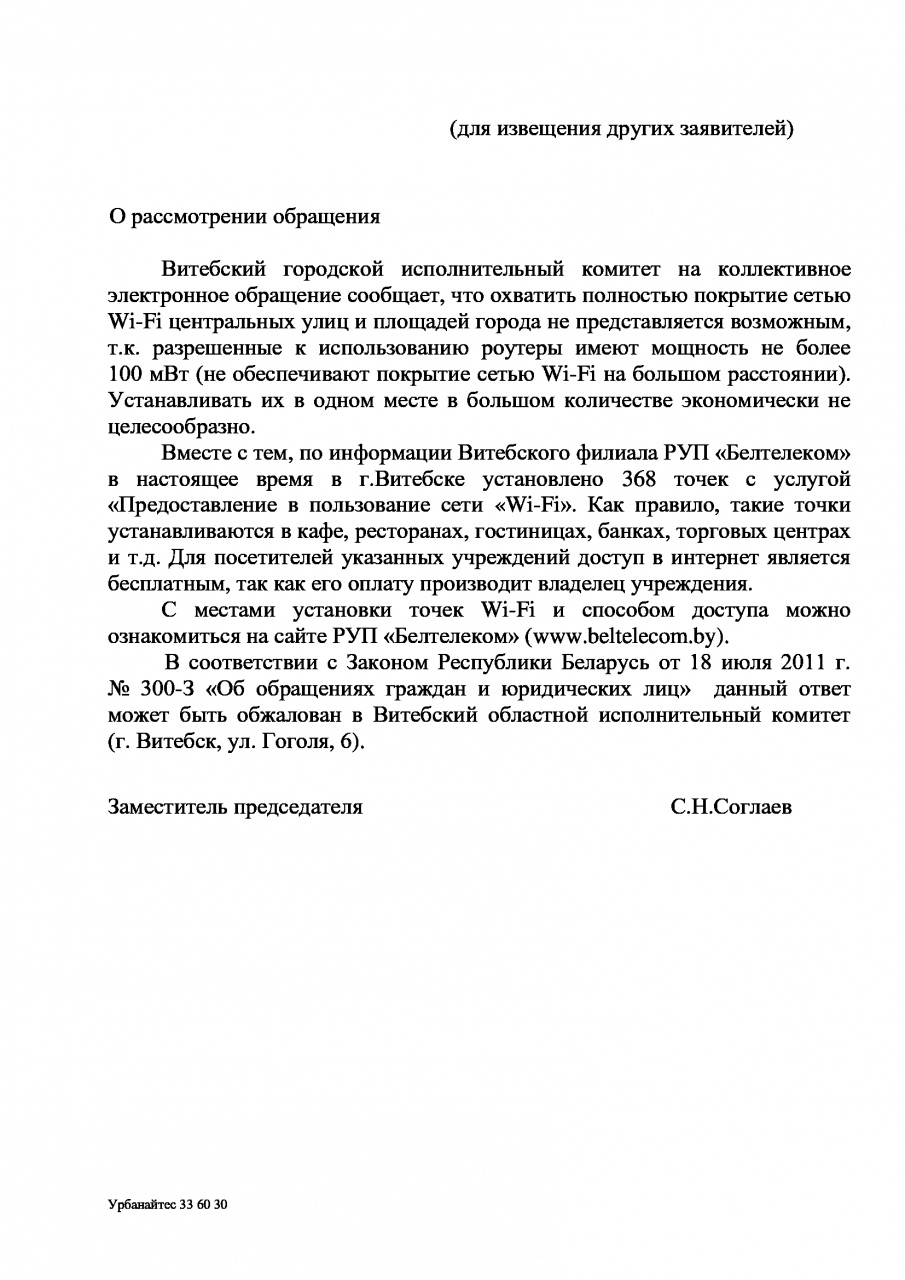 На основании ст. 41 Закона «О местном управлении и самоуправлении», которая устанавливает, что исполкомы создают условия для обеспечения граждан услугами связи, просим обеспечить публичный бесплатный доступ к Wi-Fi на центральных улицах и площадях города Витебск.