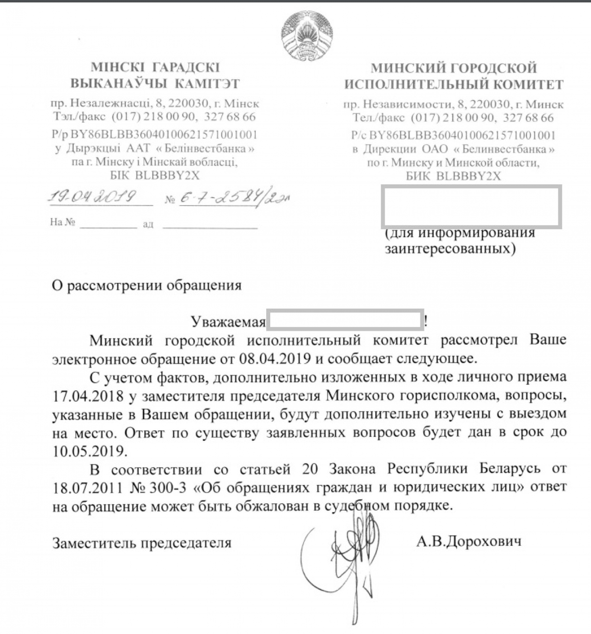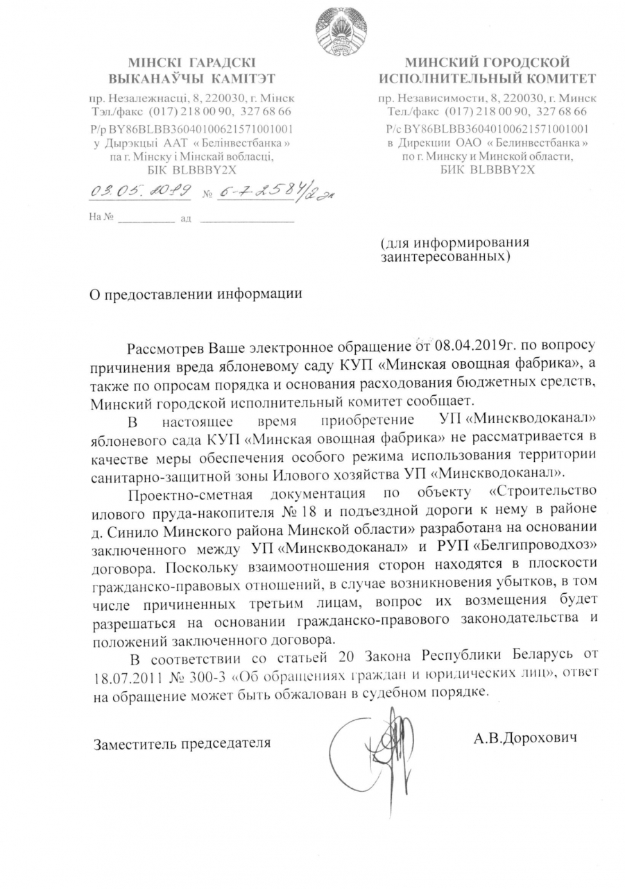 26 марта 2019 в Комитет государственного контроля направлено электронное коллективное обращение по вопросу причинения вреда яблоневому саду КУП "Минская овощная фабрика" при строительстве илового пруда УП "Минскводоканал", а также вопросам порядка и основания расходования бюджетных средств Мингорисполкомом, которое согласно уведомлению Комитета госконтроля от 02.04.2019 № 20-Б-100 Кол/1 направлено для рассмотрения в Мингорисполком.