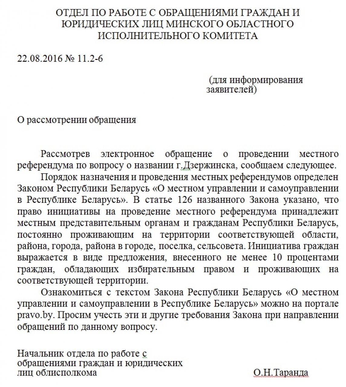 Прошу областные власти вместе с депутатами ОблСовета, подготовить процедуру проведения местного референдума, на котором поставить перед жителями Дзержинска следующий вопрос:
