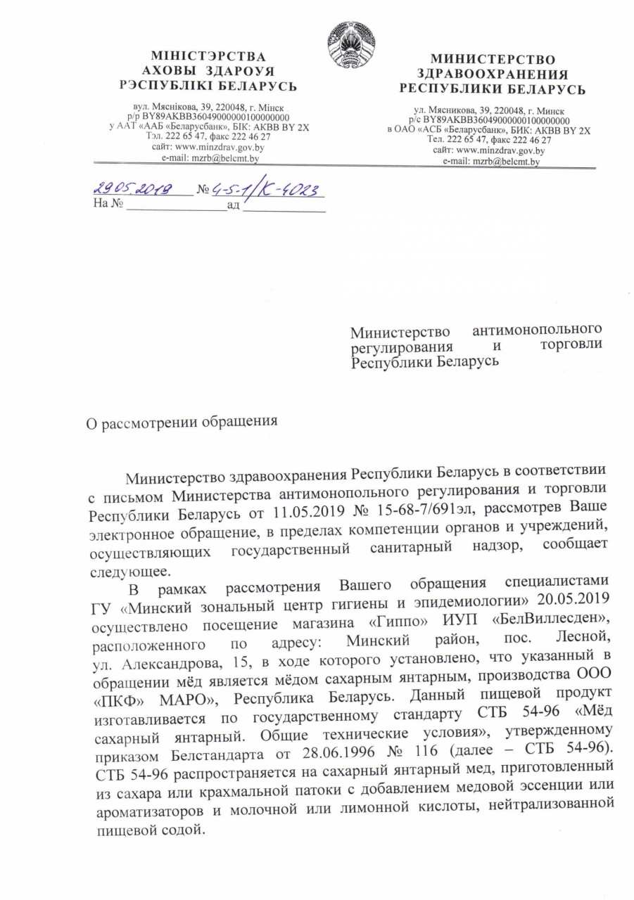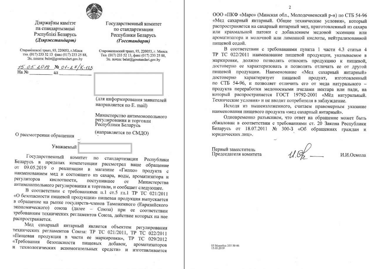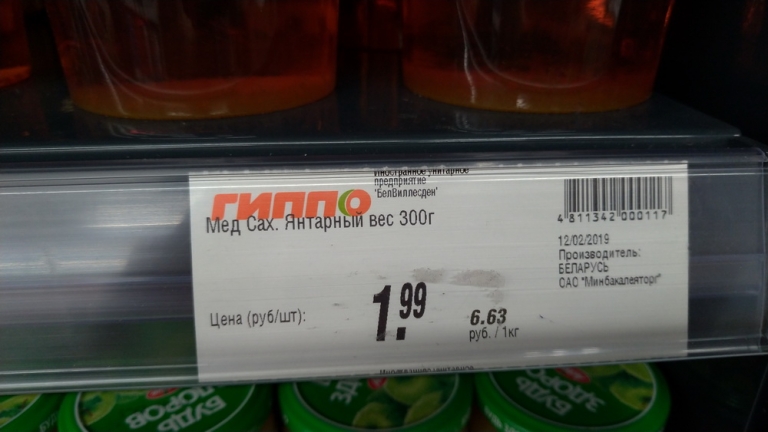 В магазине "Гиппо" (Минский р-н, а/г Лесной, ул.Александрова, 15), по нашим сведениям, под видом мёда продаётся некая искусственная субстанция, к настоящему мёду не имеющая ни малейшего отношения. И хотя на баночке также написано слово "МЁД", при ближайшем рассмотрении можно заметить, что данный продукт состоит из сахара, воды, ароматизатора и регуляторов кислотности.