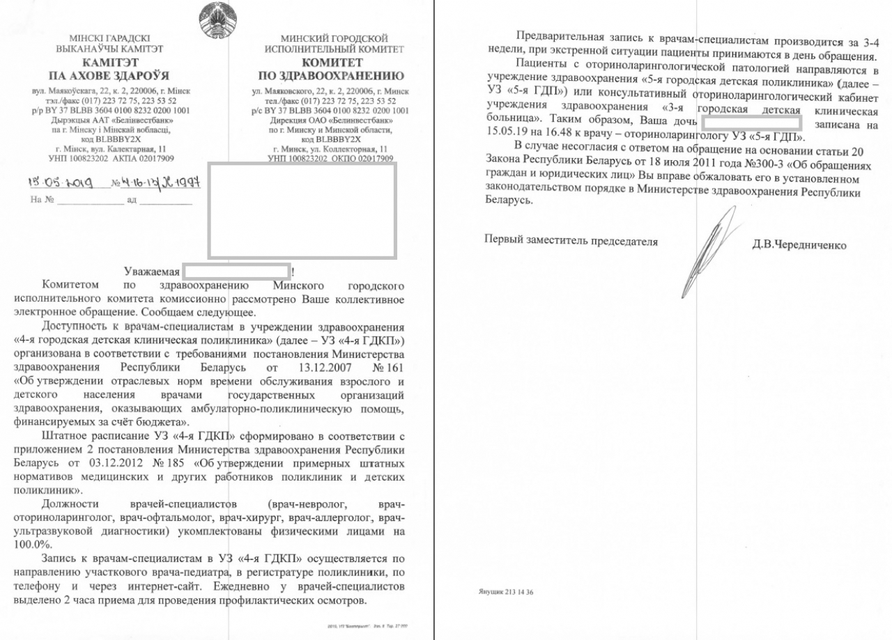 На основании Положения о Министерстве здравоохранения, утвержденного Постановлением Совета Министров Республики Беларусь от 28.10.2011 N 1446, которым установлено, что основной задачей Минздрава является организация оказания медицинской помощи населению Республики Беларусь, убедительно просим оказать помощь УЗ "4-я городская детская клиническая поликлиника" в поиске и укомплектовании штата данной поликлиники следующими специалистами: отоларинголог, невролог, окулист, аллерголог, УЗИ-диагност и таким образом дать возможность семьям вырастить здоровых детей.