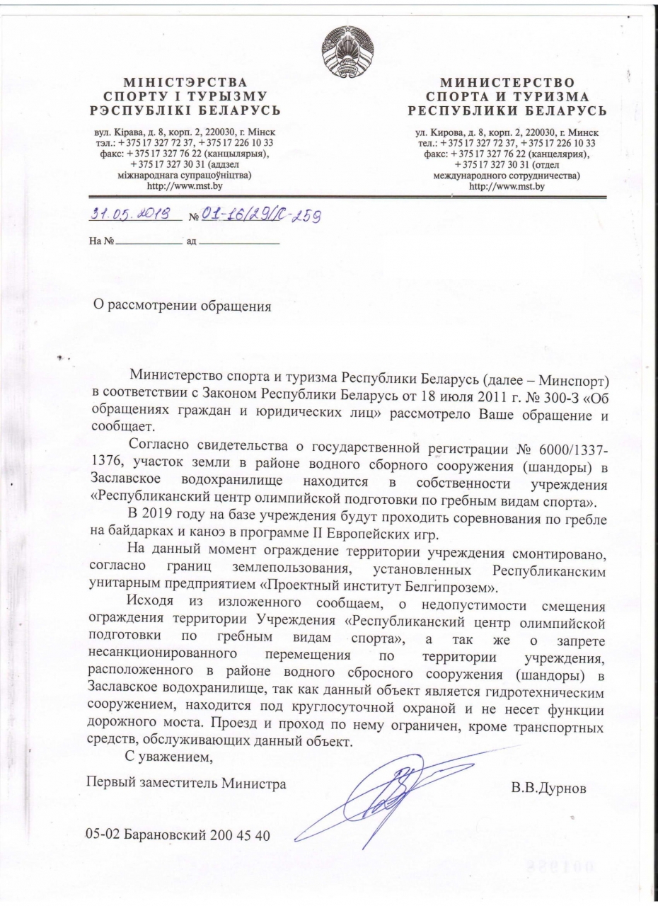 Таким образом, просим рассмотреть возможность смещения забора, ограждающего территорию Республиканского центра олимпийской подготовки по гребным видам спорта и примыкающего к Заславскому водохранилищу и таким образом обеспечить проезд велосипедистам вдоль водохранилища.