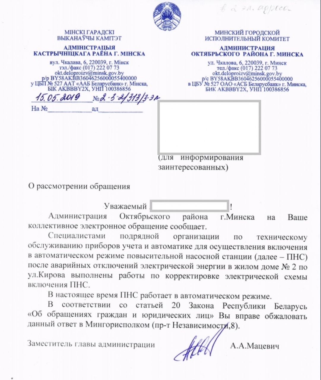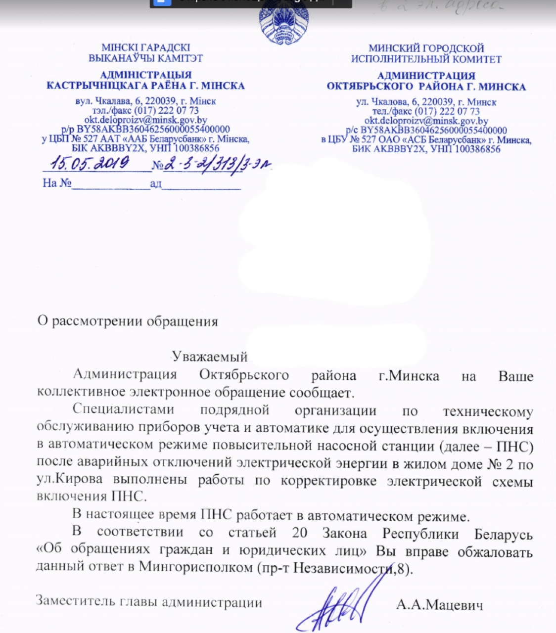 На основании ст. 41 Закона «О местном управлении и самоуправлении», которая устанавливает, что исполкомы организуют на соответствующей территории газоснабжение, электроснабжение, теплоснабжение, водоснабжение граждан, водоотведение, обеспечивают потребность населения в питьевой воде, снабжение граждан топливом, мы просим: