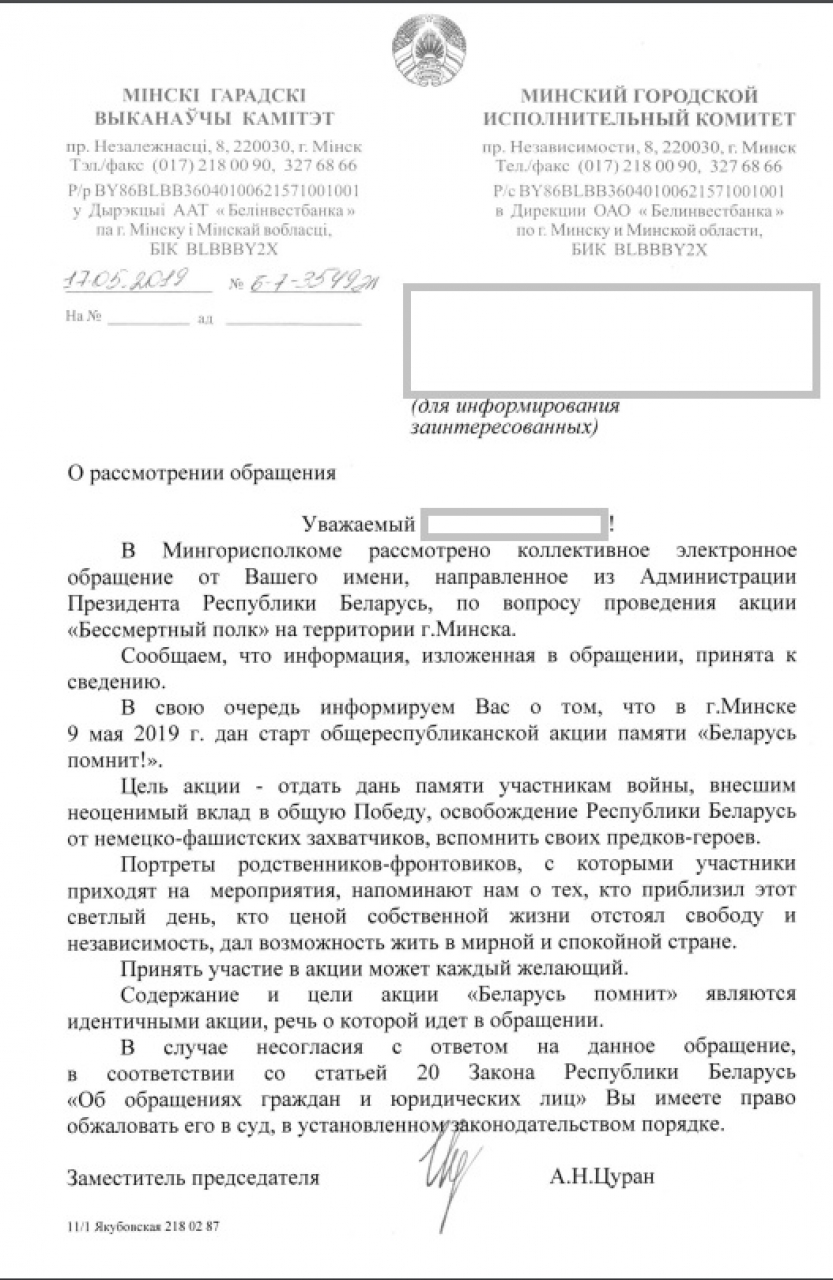 Таким образом, при рассмотрении вопроса о проведении подобной акции в Минске и (или) иных населённых пунктах Беларуси просим принять во внимание, что мы, граждане Республики Беларусь, настоящим обращением выражаем свою поддержку в проведении акций «Бессмертного полка» в нашей республике в День Победы и готовность принимать в них самое активное участие.