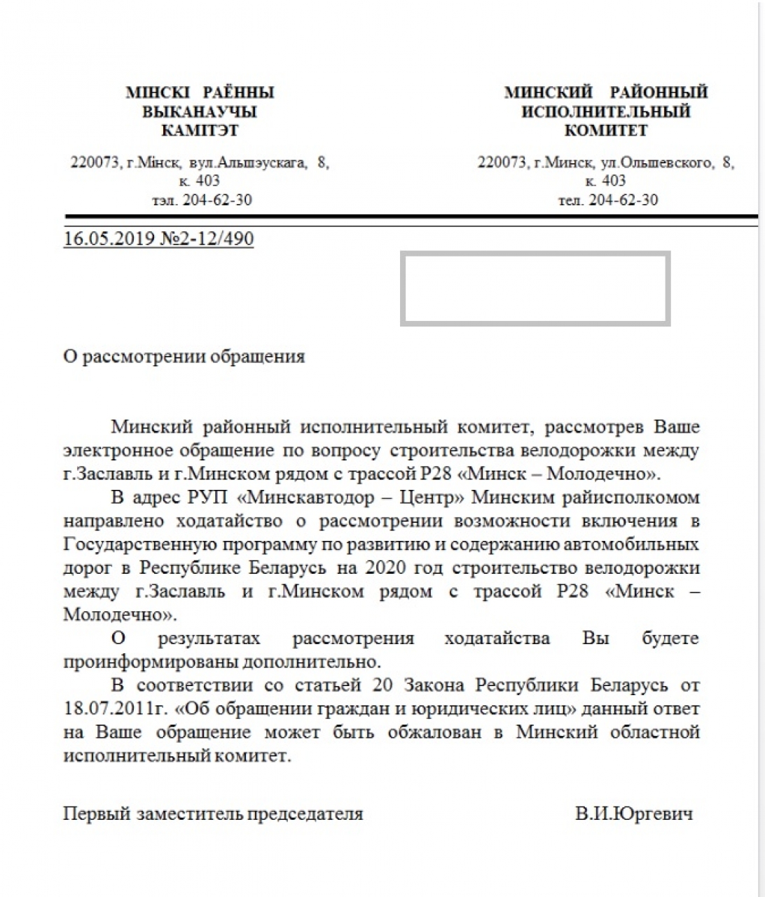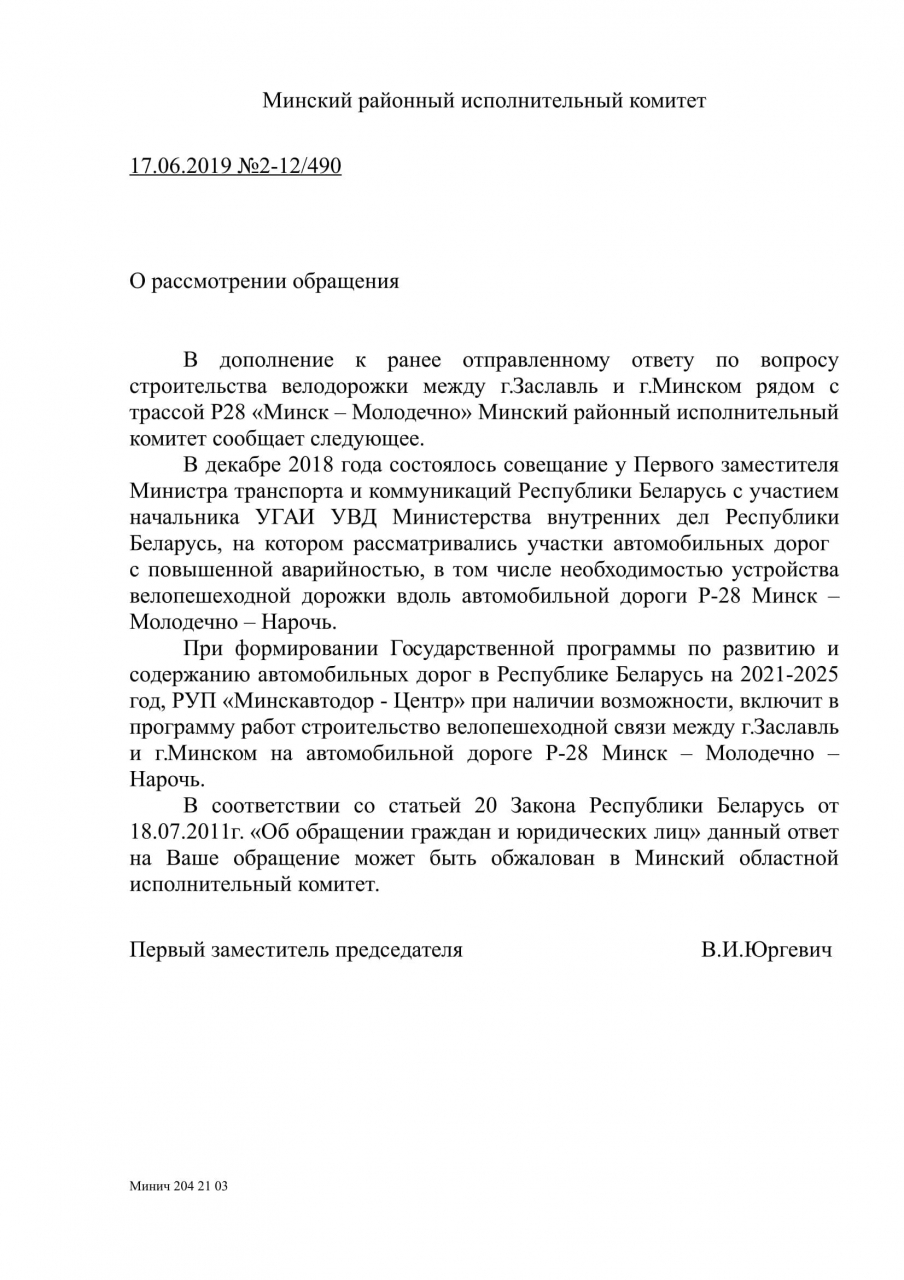 В ответ на наше обращение по поводу оборудования велодорожки Минск-Заславль от 3 марта 2019 г. в РУП "Минскавтодор-Центр" пришел ответ, что в Государственной программе по развитию и содержанию автомобильных дорог в Республике Беларусь на 2017-2020 гг, утв. Постановлением Совмина от 18.09.2017 №699, устройство велодорожки от Минска до Заславля не предусмотрено. Принимая во внимание полученный ответ, мы просим рассмотреть возможность включения устройства велодорожки Минск-Заславль в Государственную программу по развитию и содержанию автомобильных дорог в Республике Беларусь на ближайшие годы.