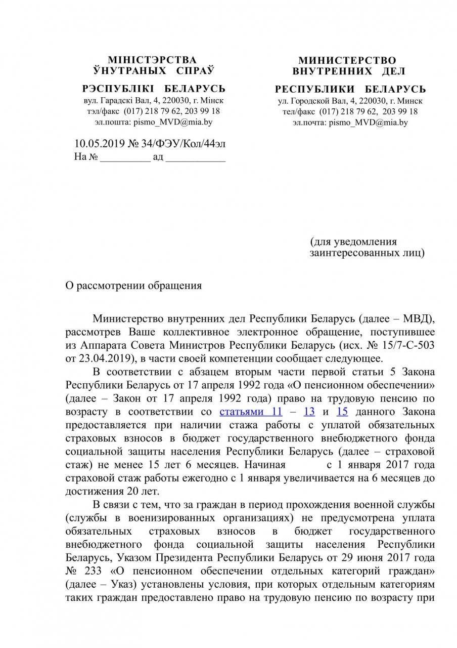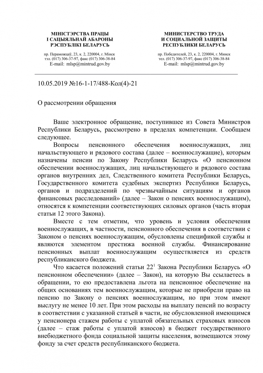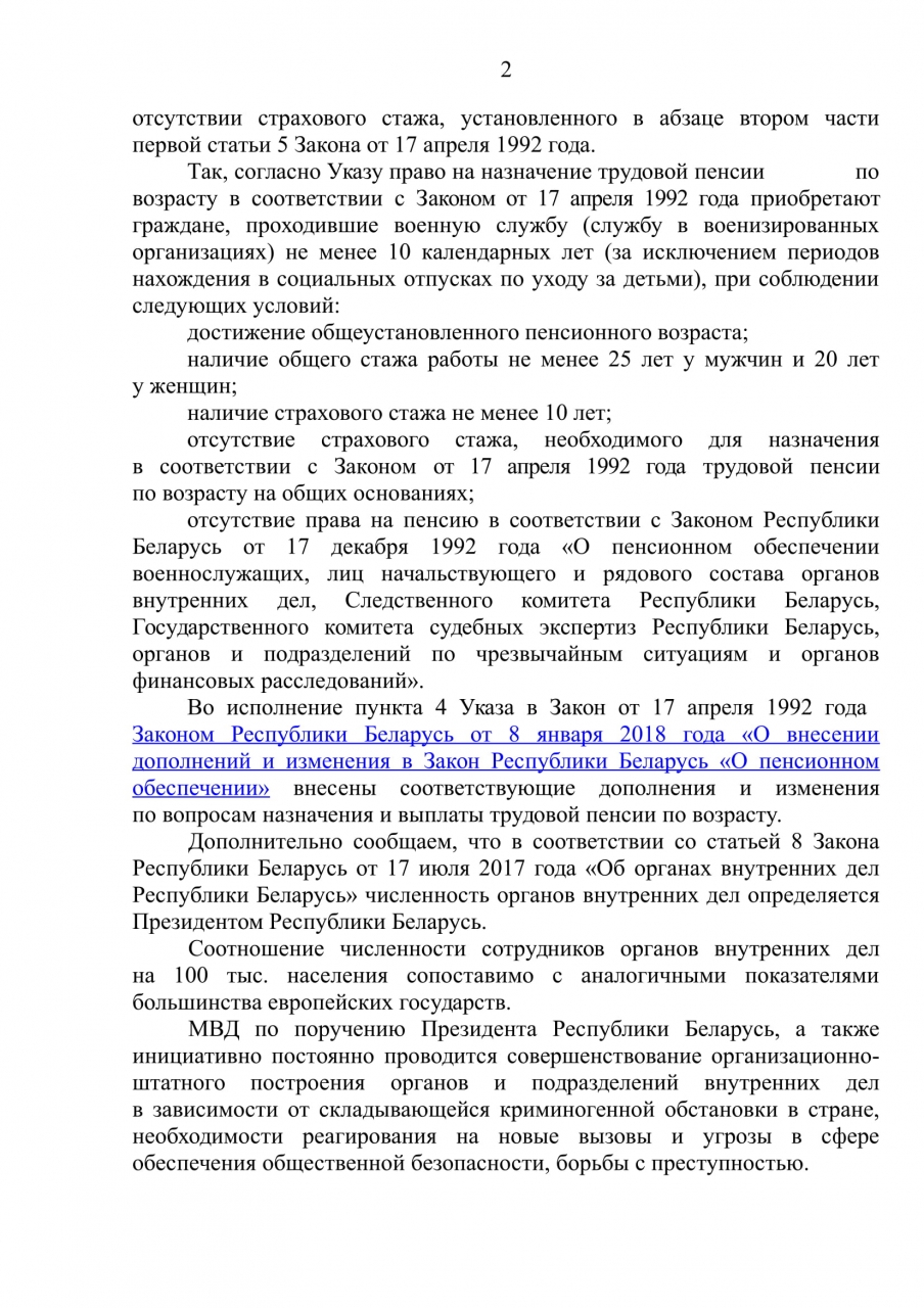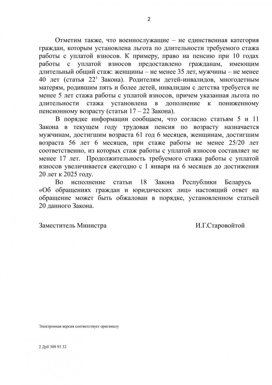 В то время как лица, достигшие общеустановленного пенсионного возраста, не имеющие требуемого в соответствии с указанным Законом стажа работы с уплатой обязательных страховых взносов в бюджет фонда, имеют право на пенсию по возрасту, в том числе лица, проходившие военную службу (службу в военизированных организациях), - мужчины при стаже работы не менее 25 лет и женщины при стаже работы не менее 20 лет, включая не менее 10 календарных лет военной службы (службы в военизированных организациях), и отсутствии права на пенсию в соответствии с Законом Республики Беларусь "О пенсионном обеспечении военнослужащих, лиц начальствующего и рядового состава органов внутренних дел, Следственного комитета Республики Беларусь, Государственного комитета судебных экспертиз Республики Беларусь, органов и подразделений по чрезвычайным ситуациям и органов финансовых расследований".