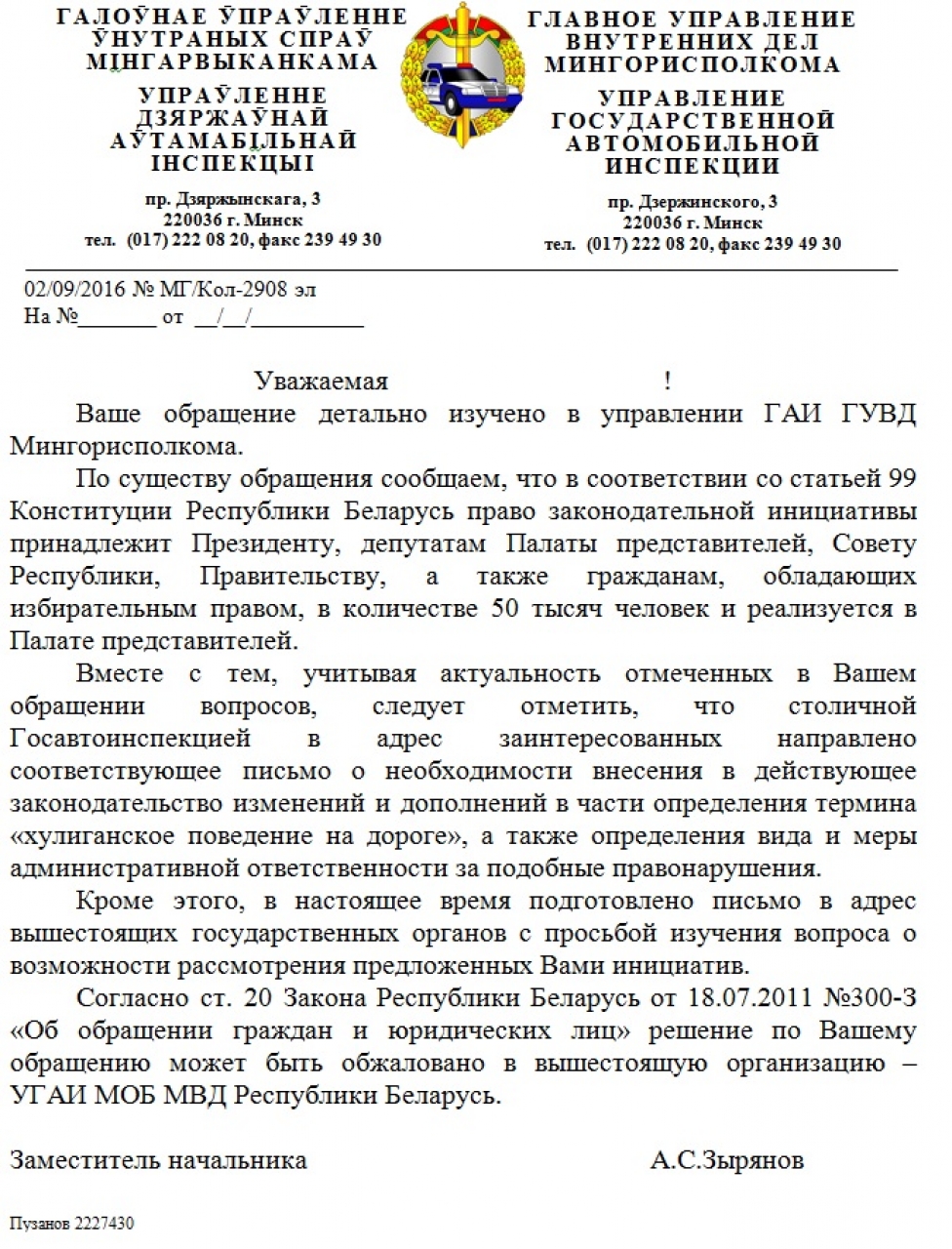 Прошу субъектов, обладающих правом законодательной инициативы, провести изучение возможности внесения в Кодекс об административных правонарушениях Республики Беларусь статьи о запрете коллективных (двух и более) заездов по городским магистралям мотоциклистов в ночное время (с 22-00 по 06-00 часов), с закреплением санкции в виде штрафа от 20 б.в. и лишения права управления транспортным средством соответствующей категории на срок до одного года в случаи повторности, для каждого из участников коллективного заезда.