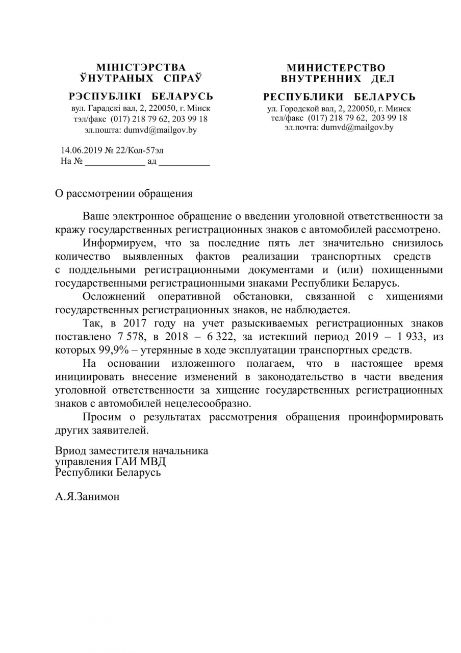 Таким образом, на основании Положения о Министерстве внутренних дел Республики Беларусь, утвержденного Указом Президента Республики Беларусь от 04.12.2007 N 611, которое устанавливает, что МВД в пределах своей компетенции и в соответствии с законодательством обобщает практику применения законов и иных нормативных правовых актов, разрабатывает предложения по их совершенствованию, организует и осуществляет контроль за соблюдением законодательства в области дорожного движения и обеспечения его безопасности, предлагаем при очередной доработке законодательства за кражу государственных регистрационных знаков предусмотреть уголовную ответственность по аналогии с действующим законодательством РФ или в редакции.