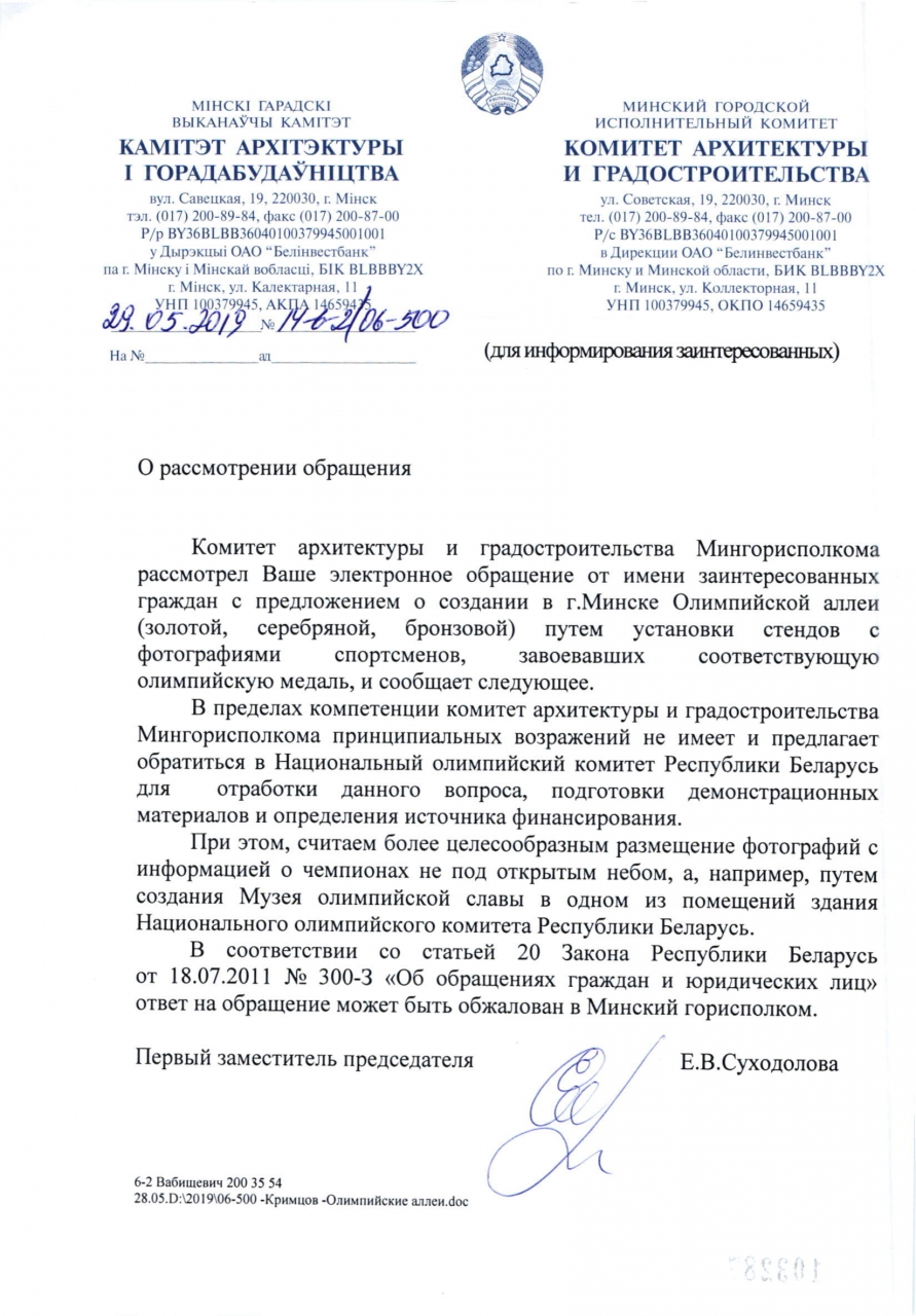 В связи с этим на основании ст. 41 Закона «О местном управлении и самоуправлении», которая устанавливает, что исполкомы организуют работу по благоустройству, обеспечению надлежащего санитарного состояния, озеленению территорий населенных пунктов, предлагаем в Минске создать Олимпийские аллеи - Золотая аллея, Серебряная аллея и Бронзовая аллея. На каждой аллее установить стенд с фотографией спортсмена, который получил соответствующую олимпийскую медаль и год ее завоевания.