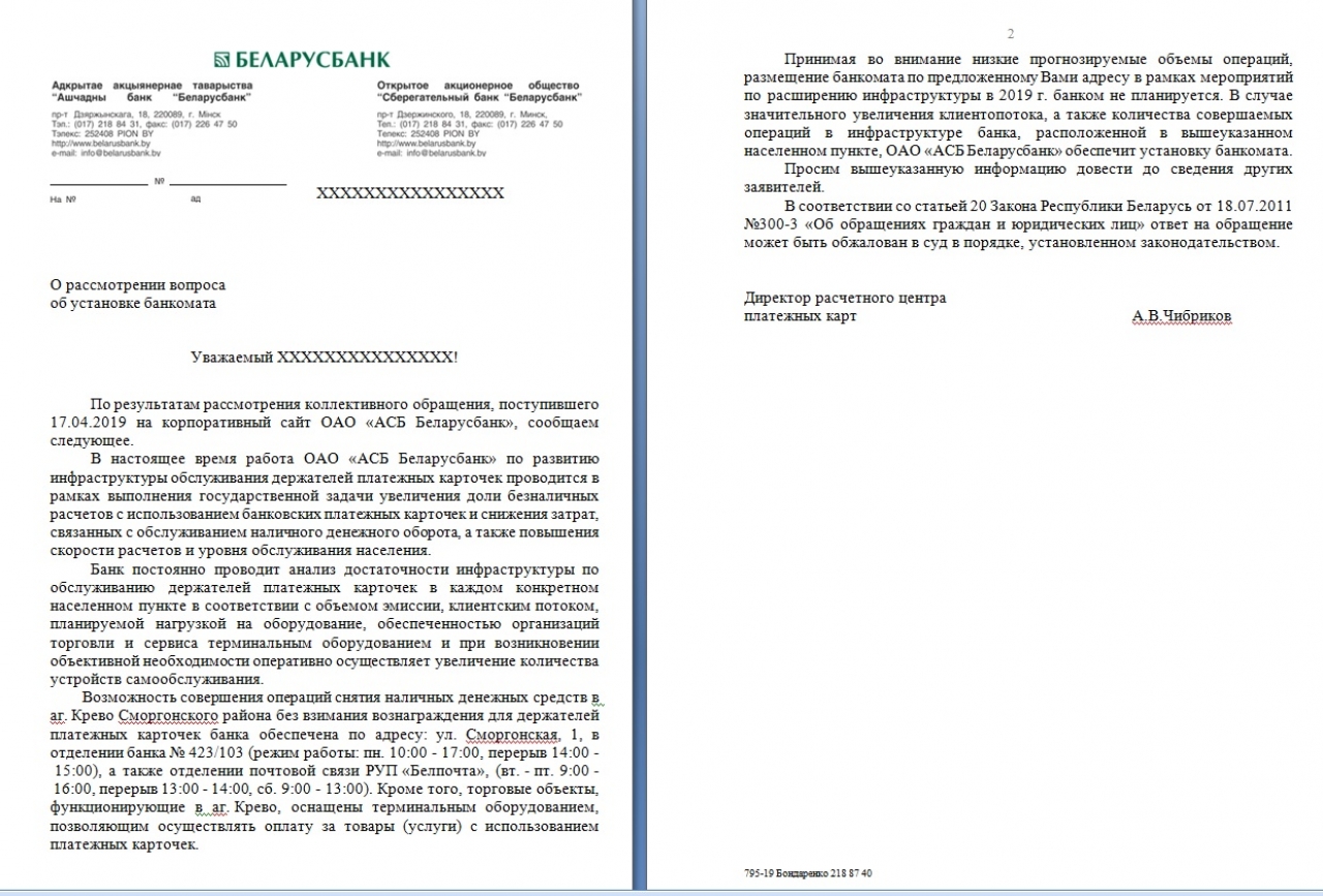 В случае значительного увеличения клиентопотока, а также количества совершаемых операций в инфраструктуре банка, расположенной в вышеуказанном населенном пункте, ОАО «АСБ Беларусбанк» обеспечит установку банкомата.