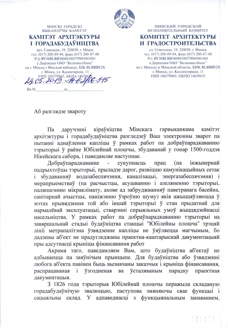 На падставе арт. 41 Закона «Аб месным кiраваннi i самакiраваннi», якая ўсталёўвае, што выканкамы арганізуюць работу па добраўпарадкаванні, забеспячэнню належнага санітарнага стану, просім гарадскія ўлады аднавіць на Юбілейнай плошчы капліцу, якая была пабудаваная ў 1826 годзе ў гонар 1500-годдзя Нікейскага сабору і дала назву сучаснай плошчы.