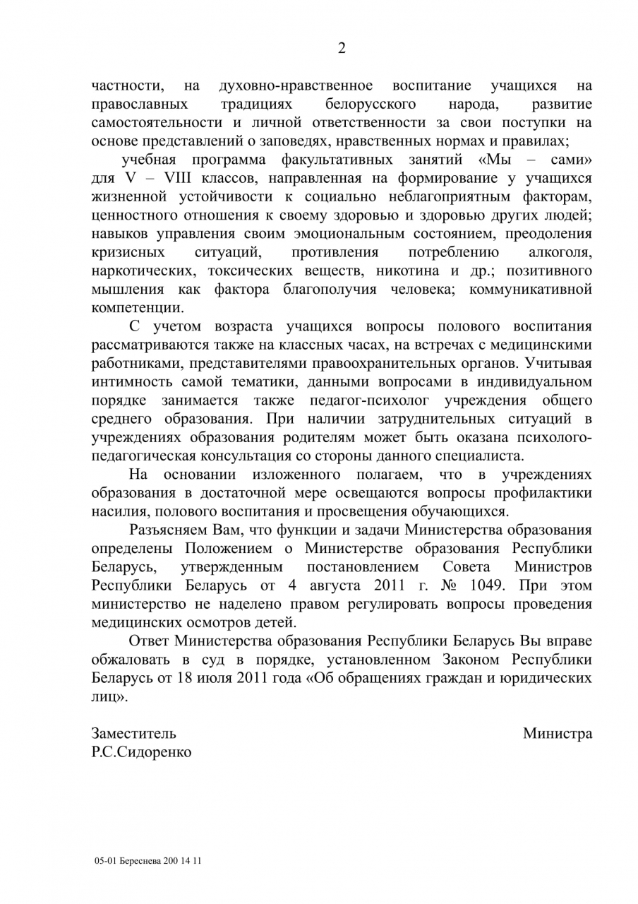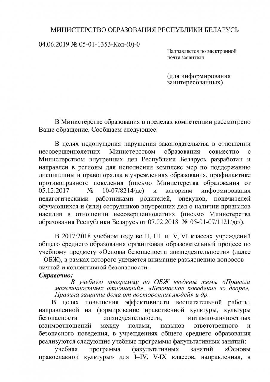 на основании Положения о Министерстве образования Республики Беларусь, утвержденного Постановлением Совета Министров Республики Беларусь от 04.08.2011 N 1049, которым к одной из главных задач Минобразования отнесено осуществление защиты их прав и законных интересов несовершеннолетних, просим в пределах компетенции Министерства образования и лично Министра Карпенко И.В.: