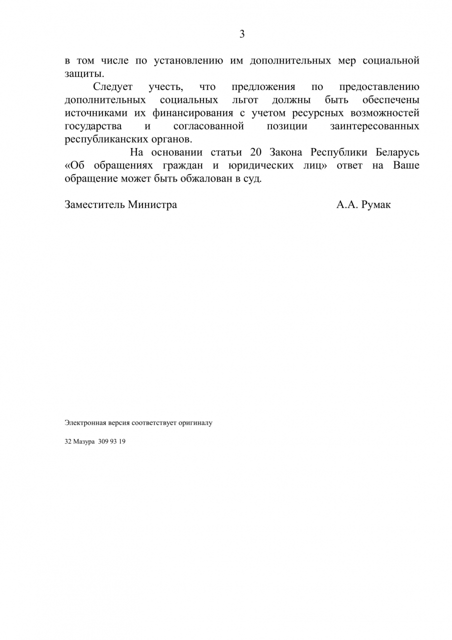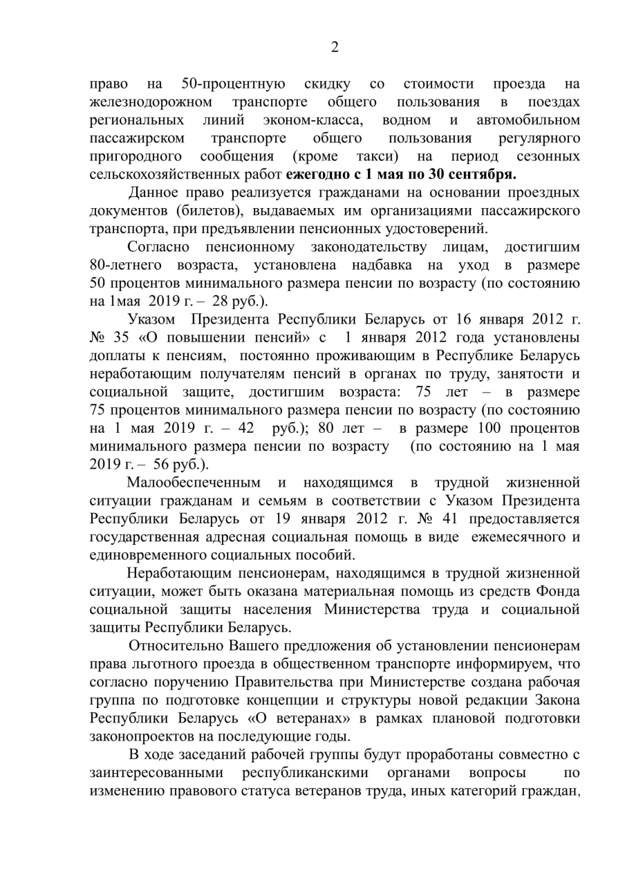 В ходе заседаний рабочей группы по подготовке концепции и структуры новой редакции Закона Республики Беларусь «О ветеранах» будут проработаны совместно с заинтересованными республиканскими органами вопросы по изменению правового статуса ветеранов труда, иных категорий граждан, в том числе по установлению им дополнительных мер социальной защиты.