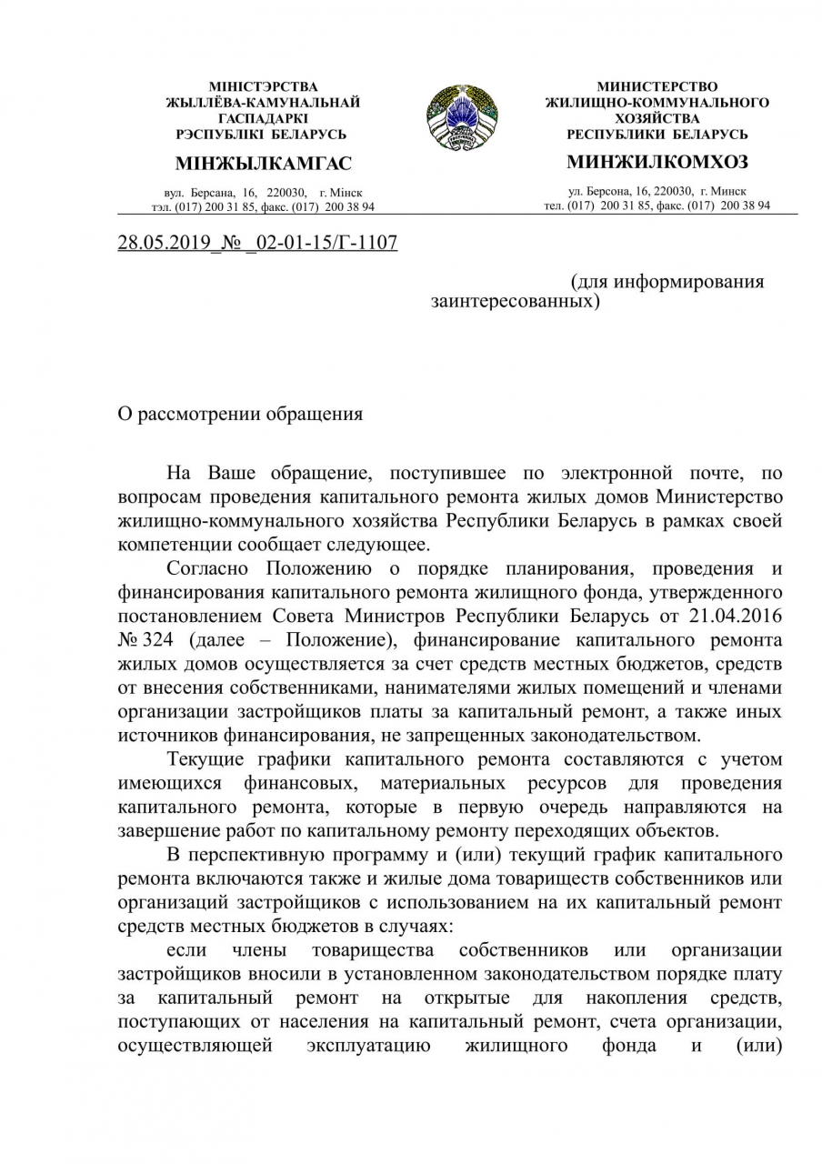 В связи с массовостью проблемы и ростом социального недовольства граждан Республики Беларусь, просим отменить Постановление Совета Министров от 21.01.2019 № 39 "О внесении изменений и дополнений в Положение о порядке планирования, проведения и финансирования капитального ремонта жилищного фонда", или пояснить причину создания такого документа, который проводит черту и разделяет условия финансовых расходов граждан.
