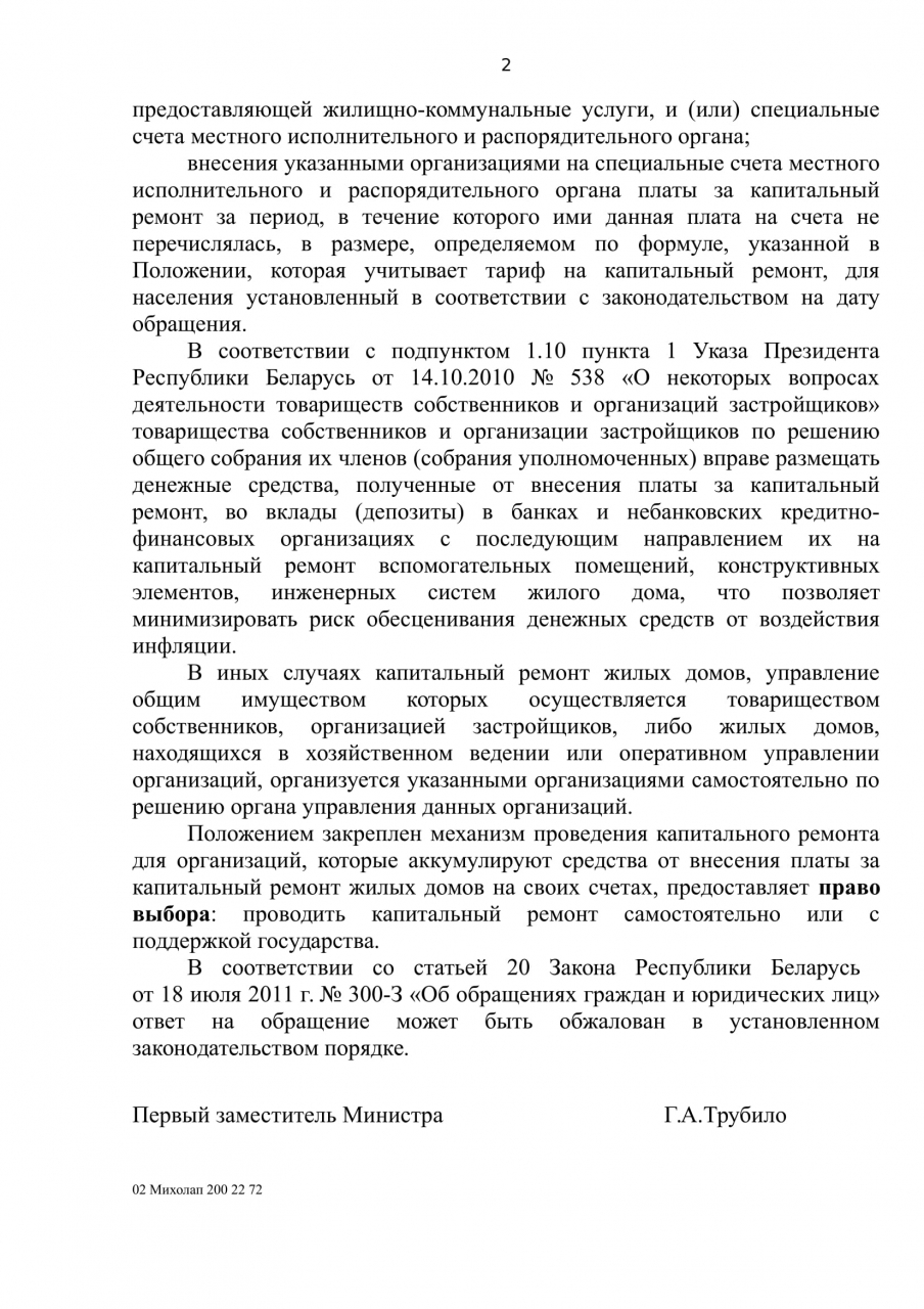 Просим ответить людям на вопрос, чем отличаются наши члены товариществ, от тех, кто в 2018 году получил помощь государства на проведение капитального ремонта без применения тарифа действующего на момент обращения, от таких же собственников, которые проживают в домах на обслуживании государственных предприятий? Получается, что люди должны за свои же деньги, заплатить 256 % государству (этот % в сотни раз больше, чем оформить кредит в банке), это так у нас думают о людях, это такое у нас получается равноправие! Получается, что собственник, являющийся членом товарищества, живёт и соблюдает действующее законодательство, надеется на социальную гарантию, согласно Конституции Республики Беларусь, в один прекрасный день, остается еще должен более чем в два с половиной раза! В такой ситуации оказались все без исключения товарищества и организации застройщиков.