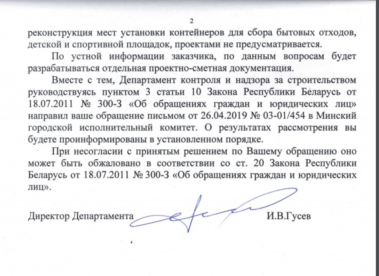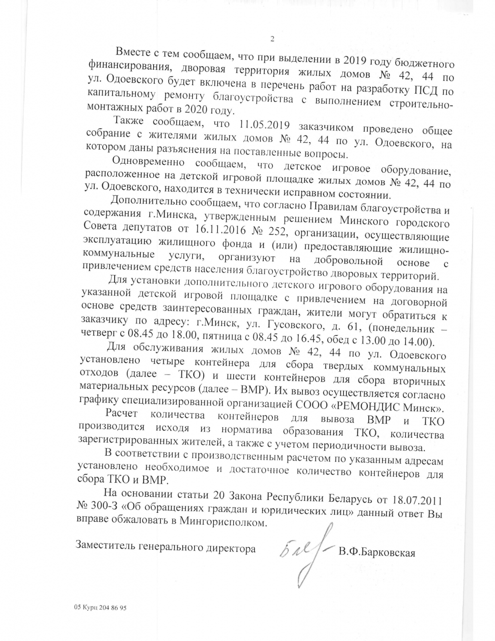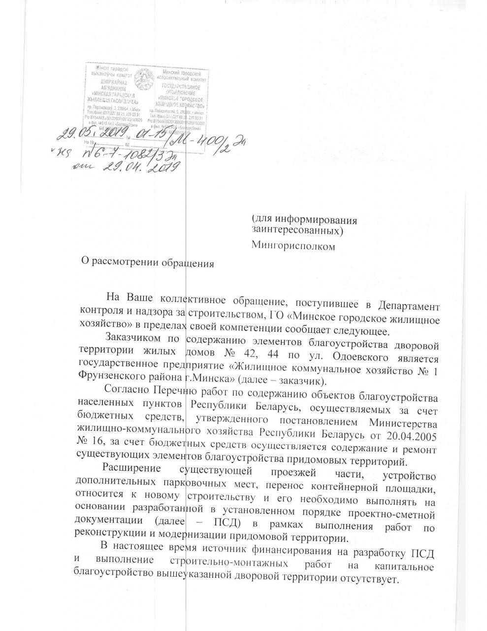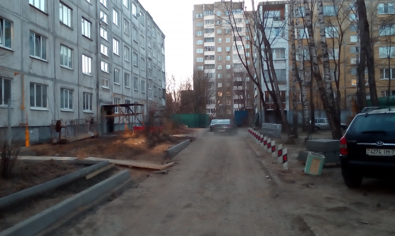 На неоднократные обращения в Администрацию Фрунзенского района г.Минска, Мингорисполком нам обещают при наличии финансирования разработать ПСД на ремонт дворовой территории в 2019 году, когда будет проведение ремонта - ещё более неизвестно. Но мы в 2019 году живём во дворе, соответствующим нормам почти полувековой давности. И в то же время в близлежащих дворах нет такой катастрофической ситуации с дворовыми проездами, количеством парковочных мест и оборудованием на детской и спортивной площадке.