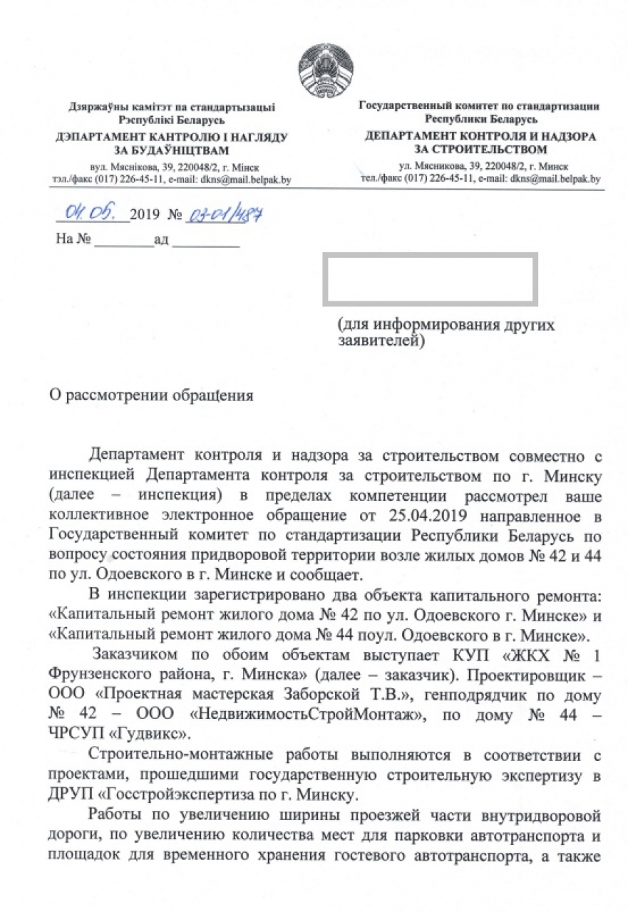 Мы, граждане, проживающие по адресу г.Минск, ул.Одоевского, д.42, д.44, а также иные заинтересованные граждане, просим проверить состояние придомовой территории возле указанных домов на соответствие существующим нормам и стандартам, а именно: