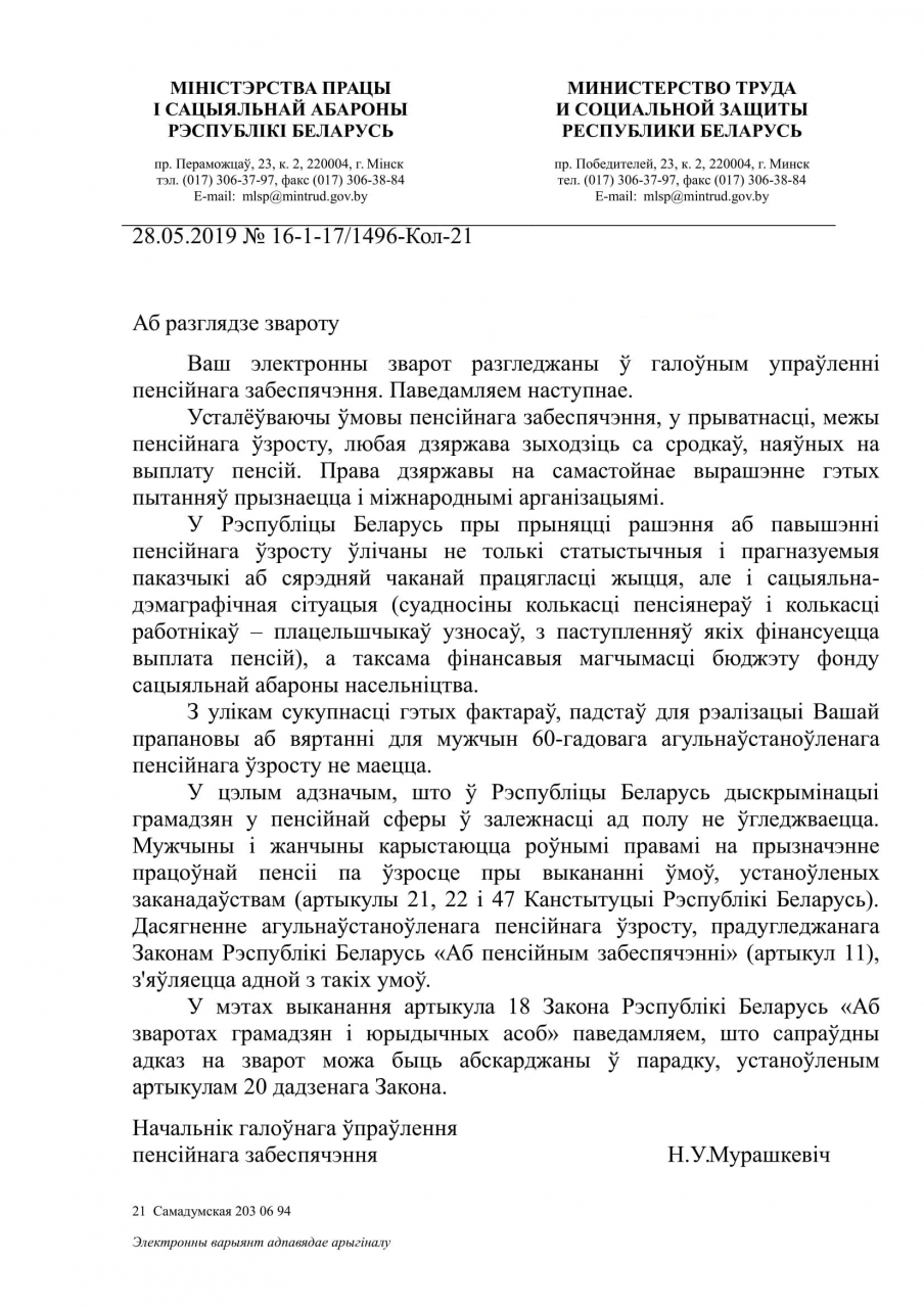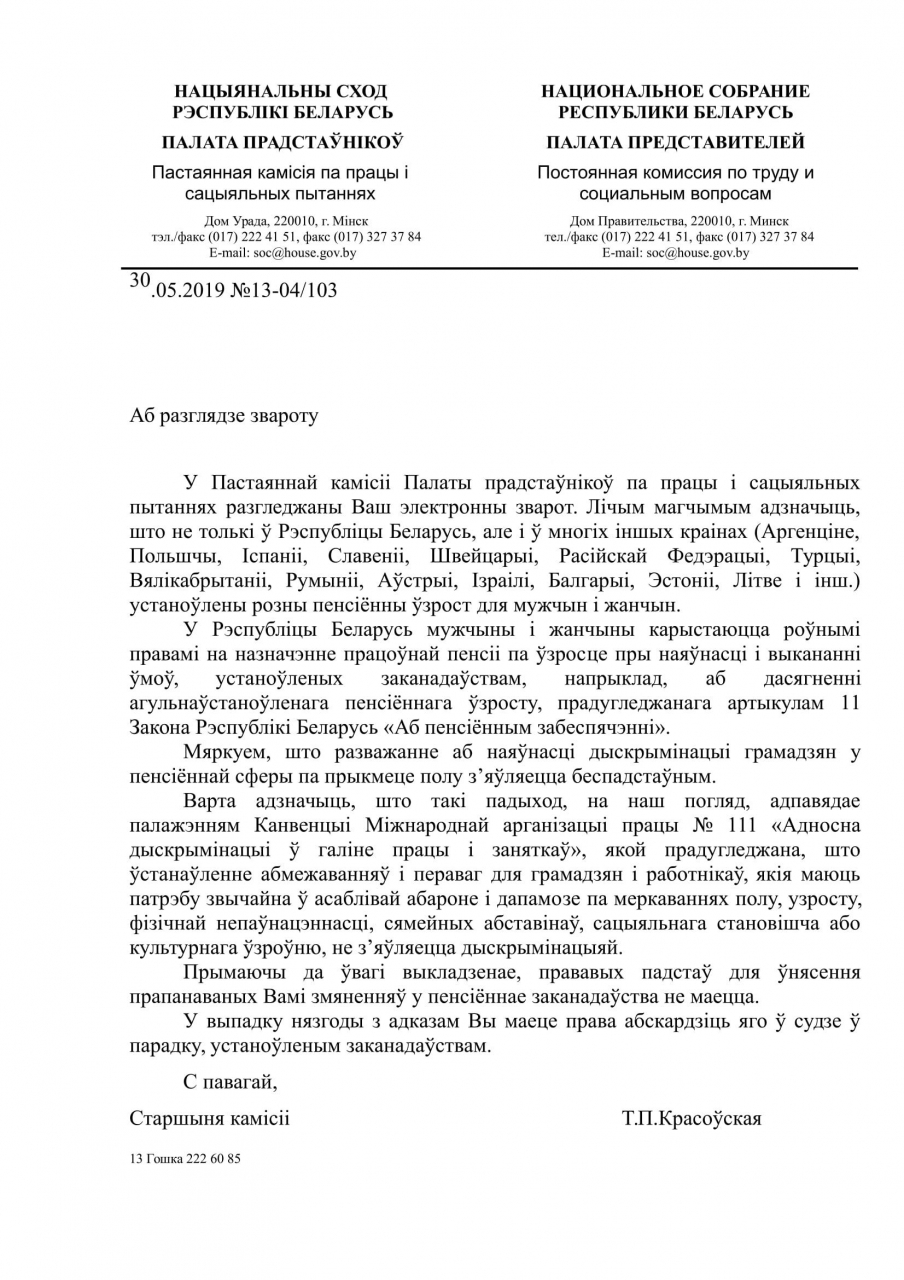 Мы просім вас ініцыяваць разгляд пытання адносна вяртання права мужчынам выхадзіць на пенсію ва ўзросце 60 год і ініцыяваць адпаведныя змены ў дзеючым заканадаўстве.