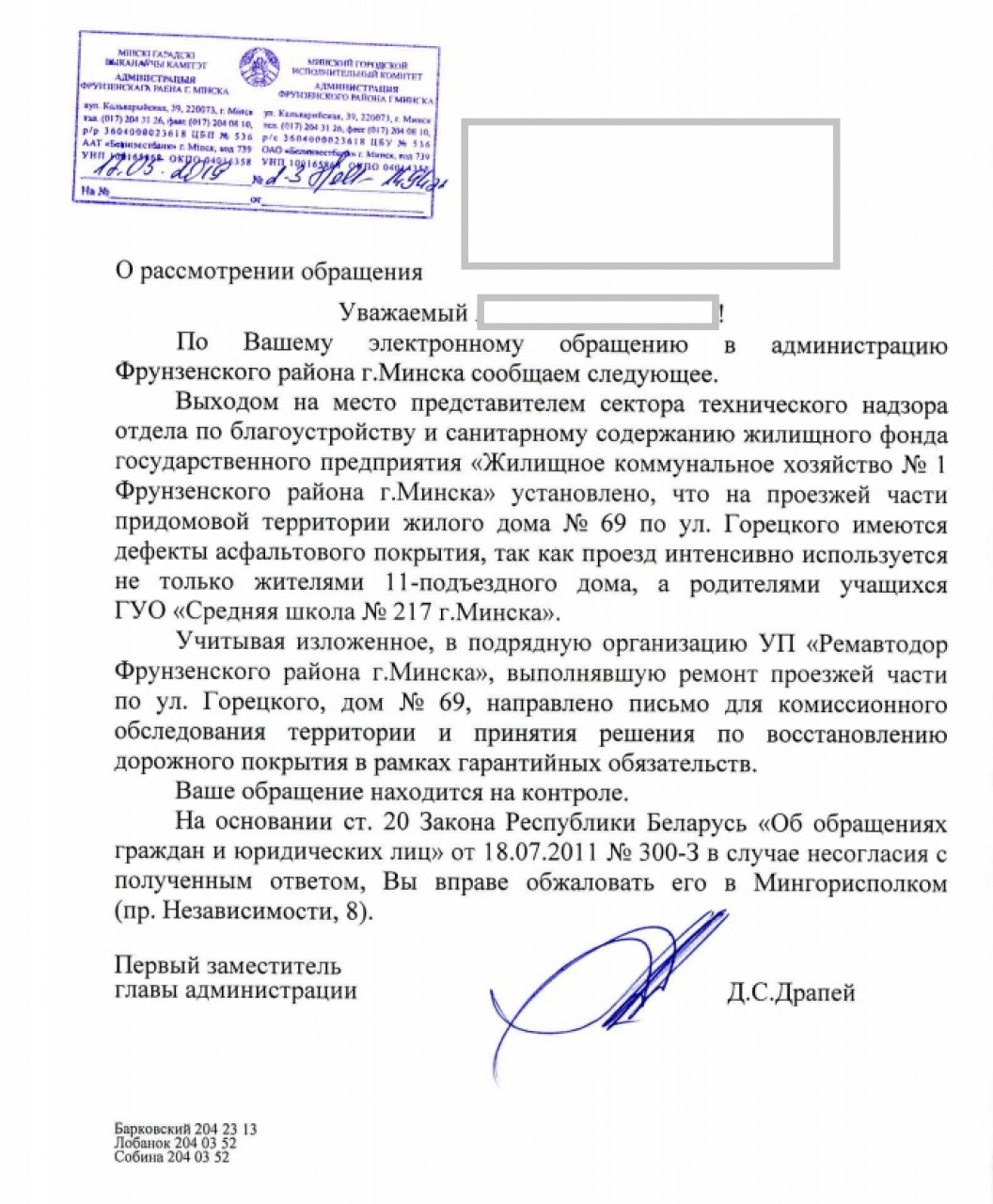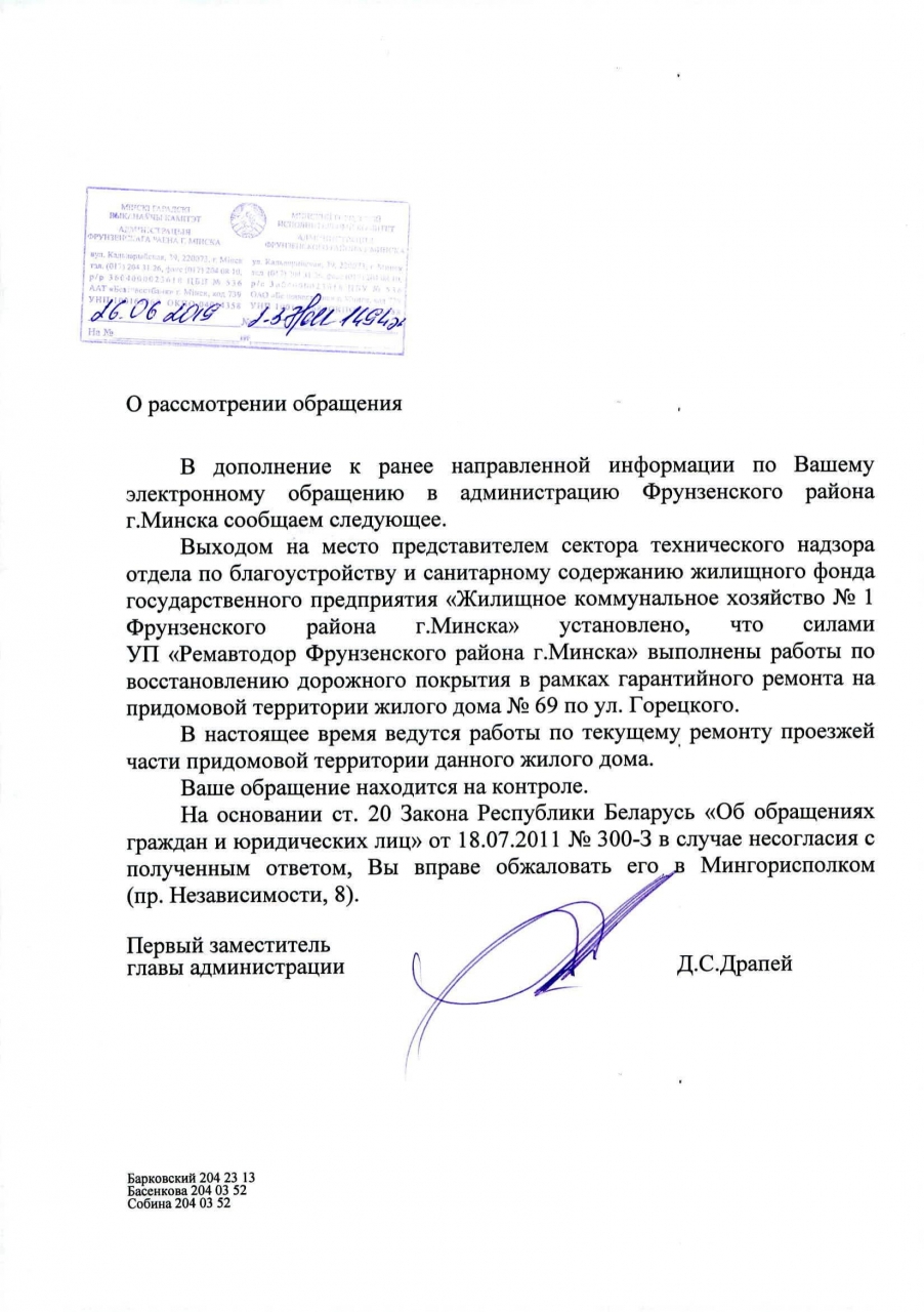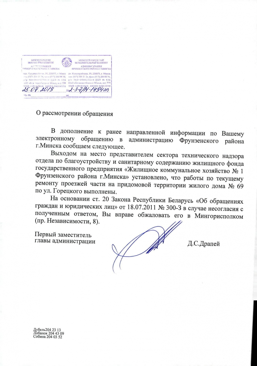 В связи с вышеописанными обстоятельствами просим предоставить сведения о том, какой гарантийный срок предоставляет организация, производившая ремонтные работы во дворе дома №69 по ул.М.Горецкого и какая сумма денежных средств из бюджета была потрачена на оказание некачественной, на наш взгляд, услуги.