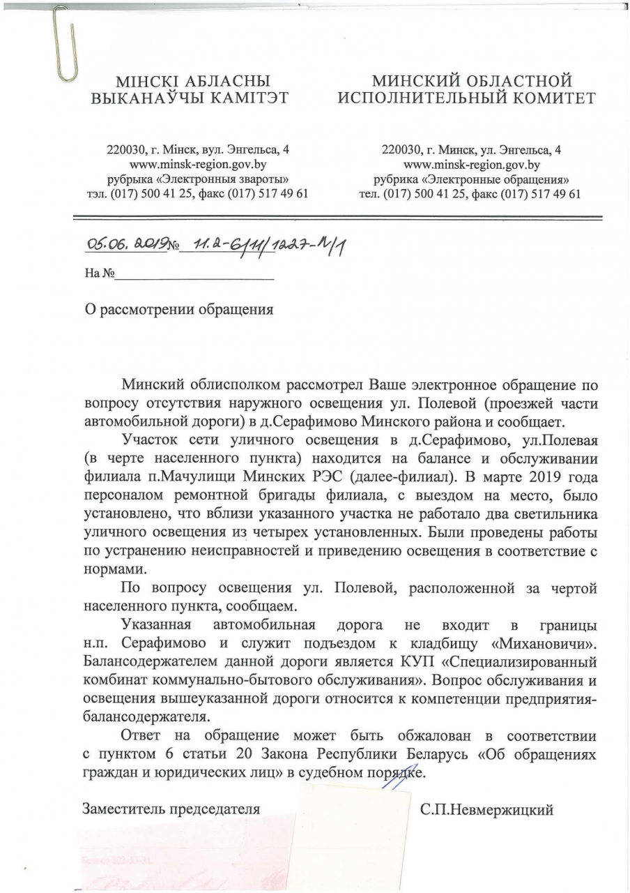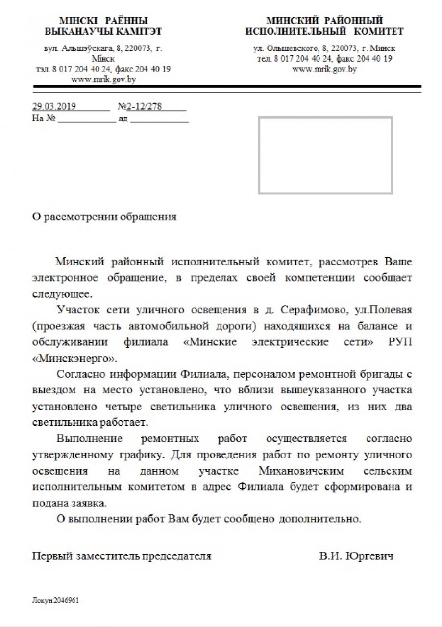 Таким образом, прошу сообщить, когда по асфальтированной части ул.Полевой в деревне Серафимово освещение будет приведено в соответствие с законодательными актами.