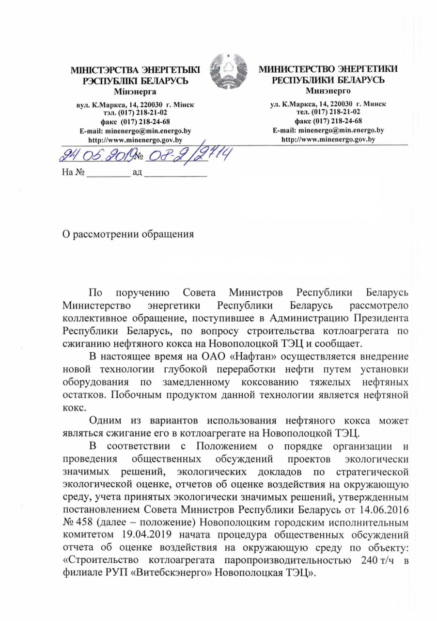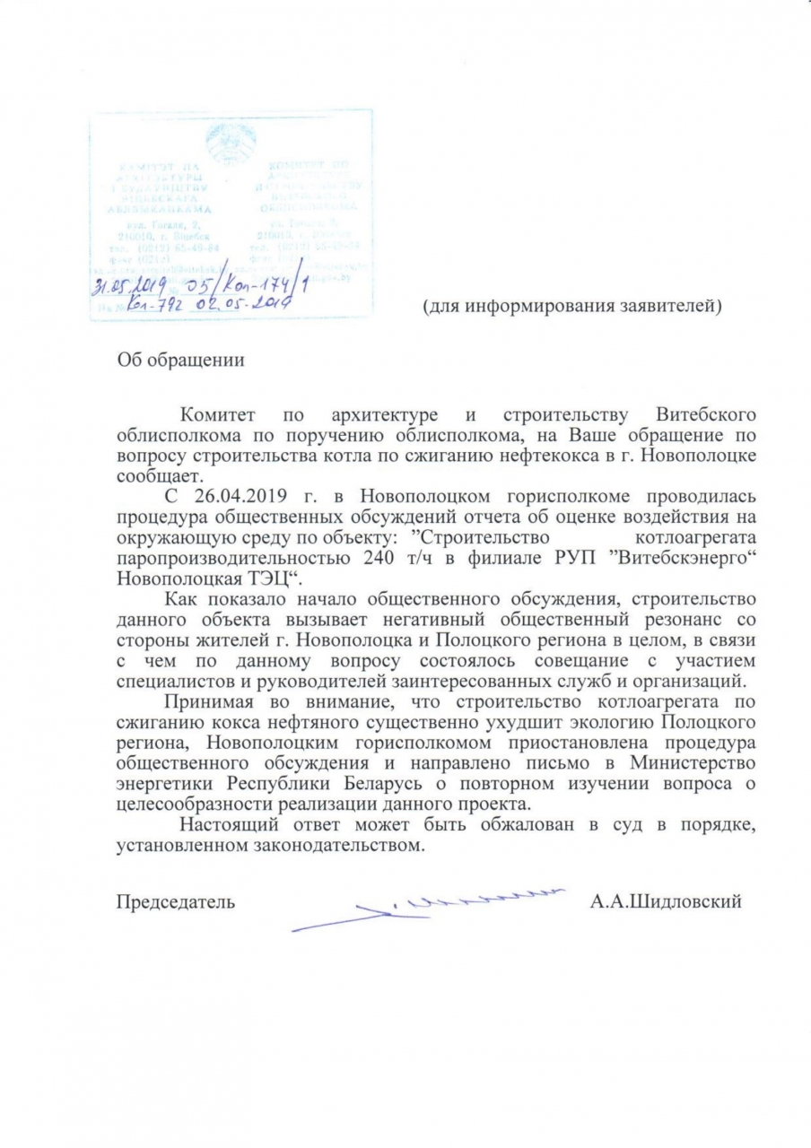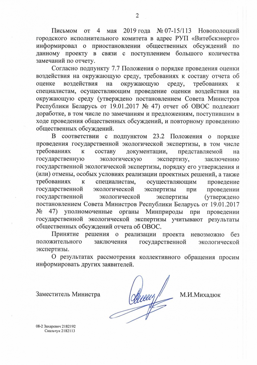 Новополоцким горисполкомом приостановлена процедура общественного обсуждения и направлено письмо в Министерство энергетики Республики Беларусь о повторном изучении вопроса о целесообразности реализации данного проекта.