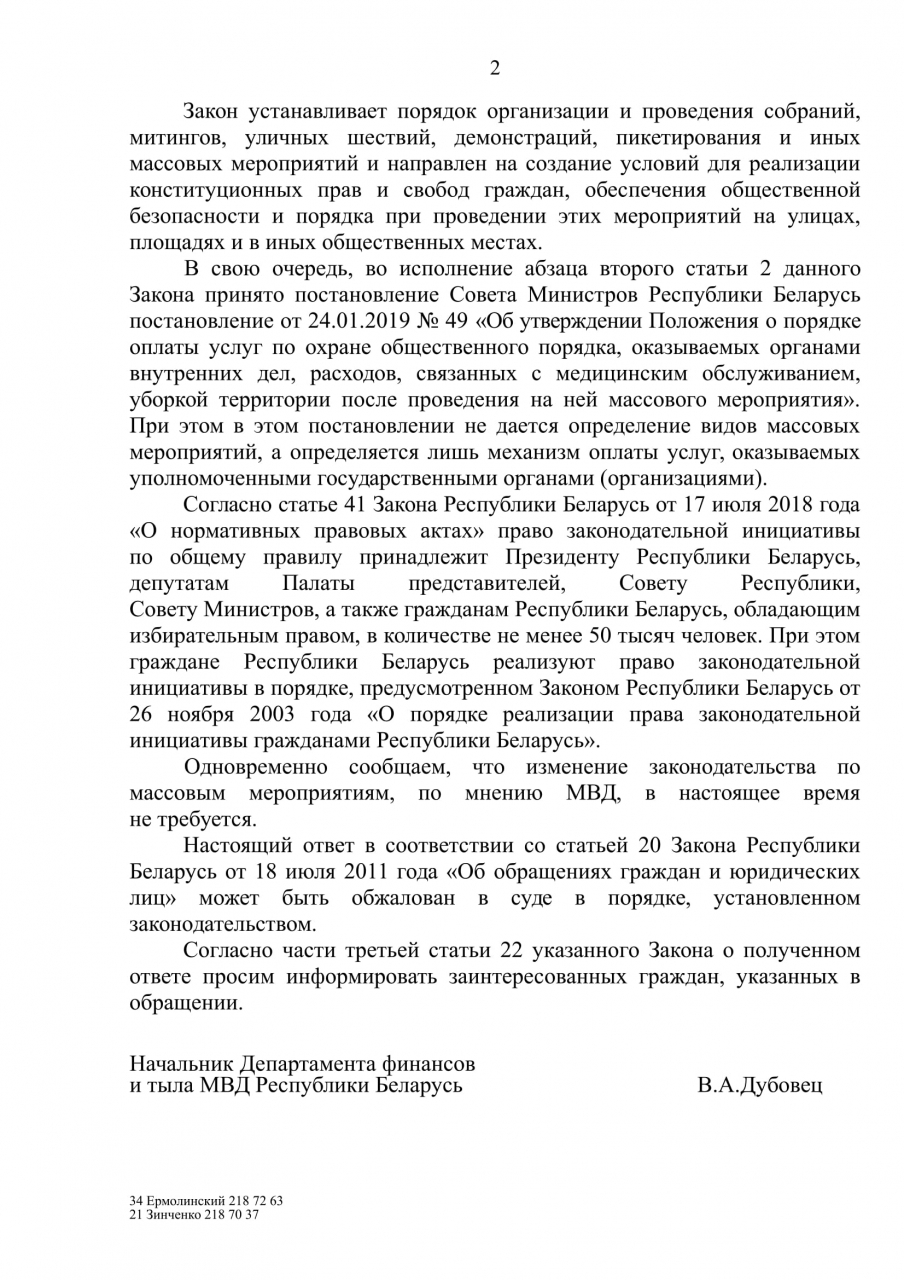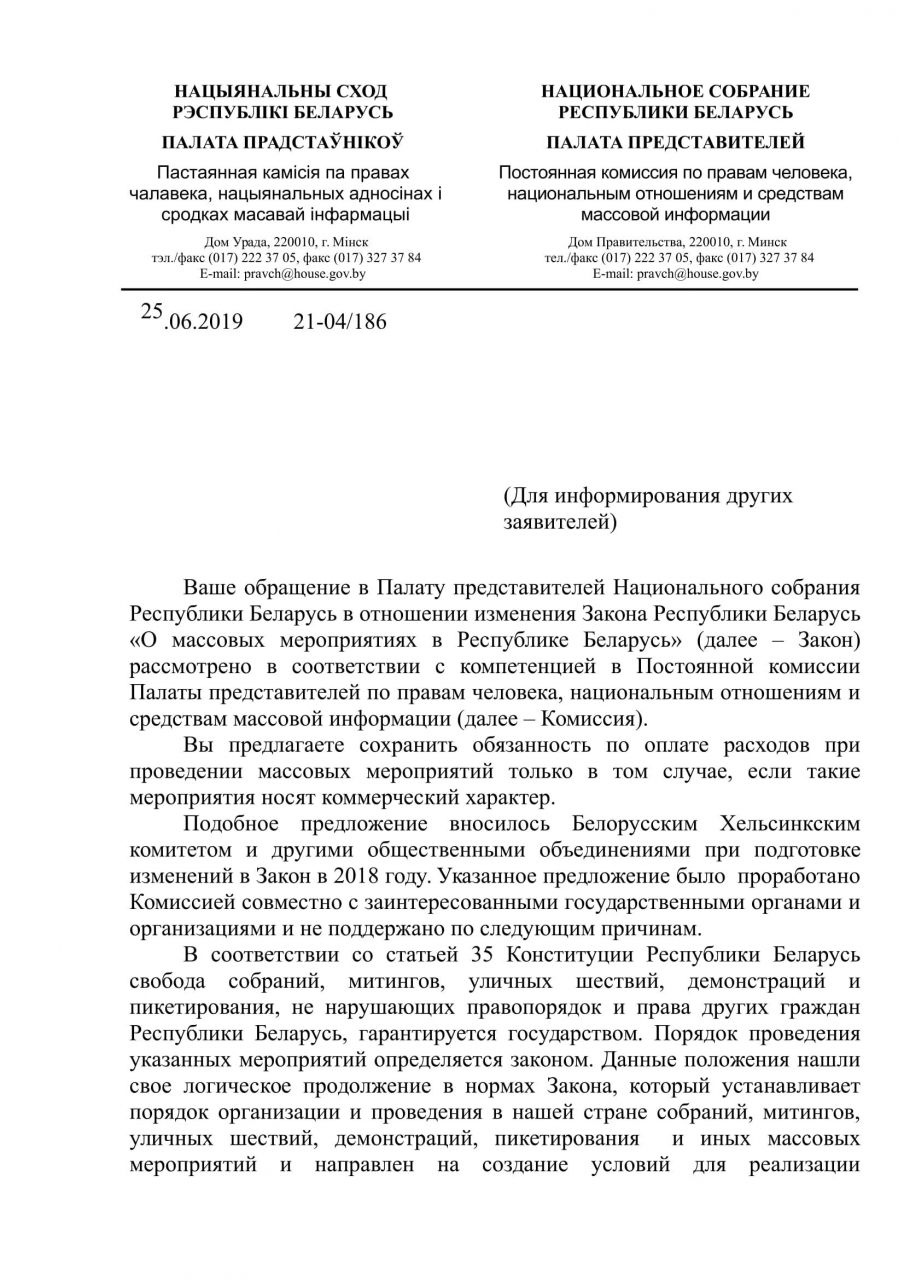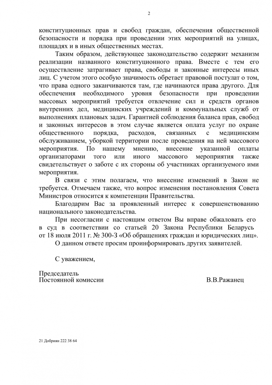 Распространение действия Постановления и статьи 10 Закона на граждан Беларуси, организовывающих некоммерческие массовые мероприятия, полагаем, является нарушением Конституции Республики Беларусь, статья 35 которой гарантирует нам право на свободу собраний, митингов, уличных шествий, демонстраций и пикетирования, не нарушающих правопорядок и права других граждан Республики Беларусь. Считаем, что действие Постановления в отношении организаторов массовых мероприятий некоммерческого характера лишают нас конституционного права на мирные собрания.