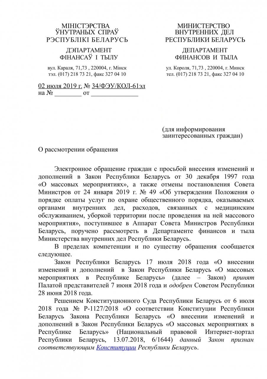 24 января 2019 года Советом министров было принято Постановление № 49 (далее - Постановление). Данное Постановление регламентирует стоимость услуг органов внутренних дел по охране общественного порядка во время проведения массовых мероприятий в следующих размерах: