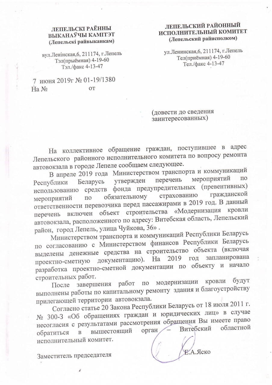 На основании изложенного и в соответствии со ст. 41 Закона «О местном управлении и самоуправлении» просим произвести реконструкцию лепельского автовокзала и посадочных платформ.