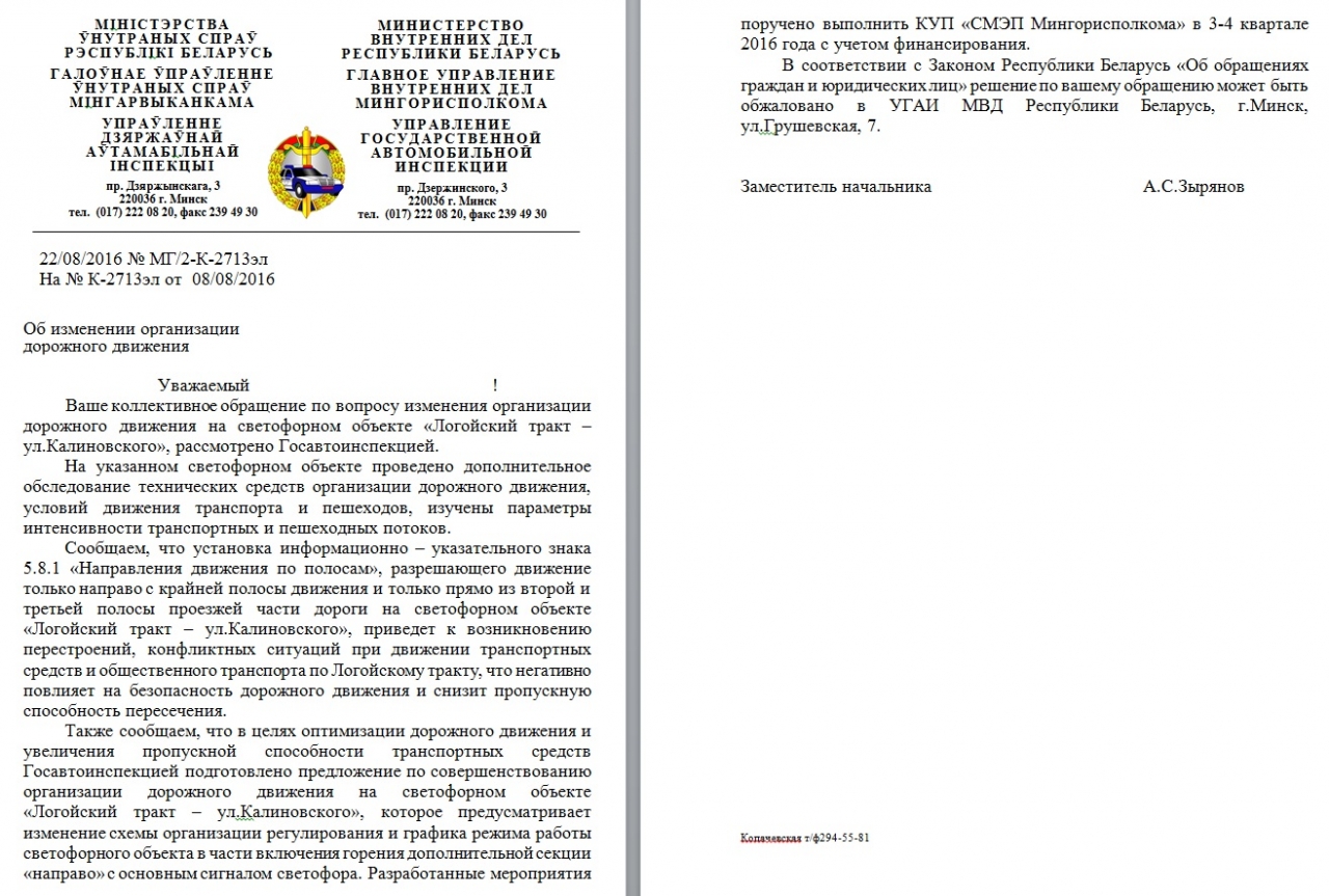По мнению ГАИ реализация предложения приведет к возникновению перестроений, конфликтных ситуаций при движении транспортных средств и общественного транспорта по Логойскому тракту, что негативно повлияет на безопасность дорожного движения и снизит пропускную способность пересечения.