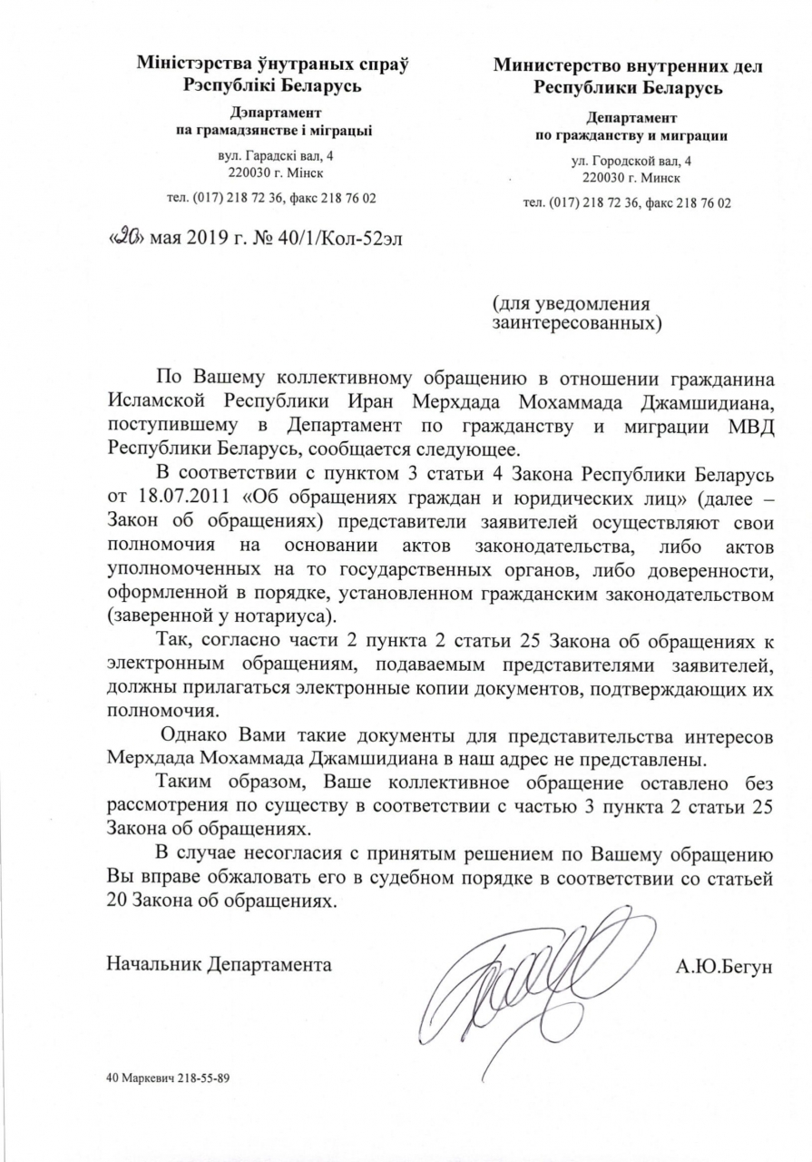 предоставить защиту или разрешение на проживание Мехрдаду Джамшидияну на территории Республики Беларусь.