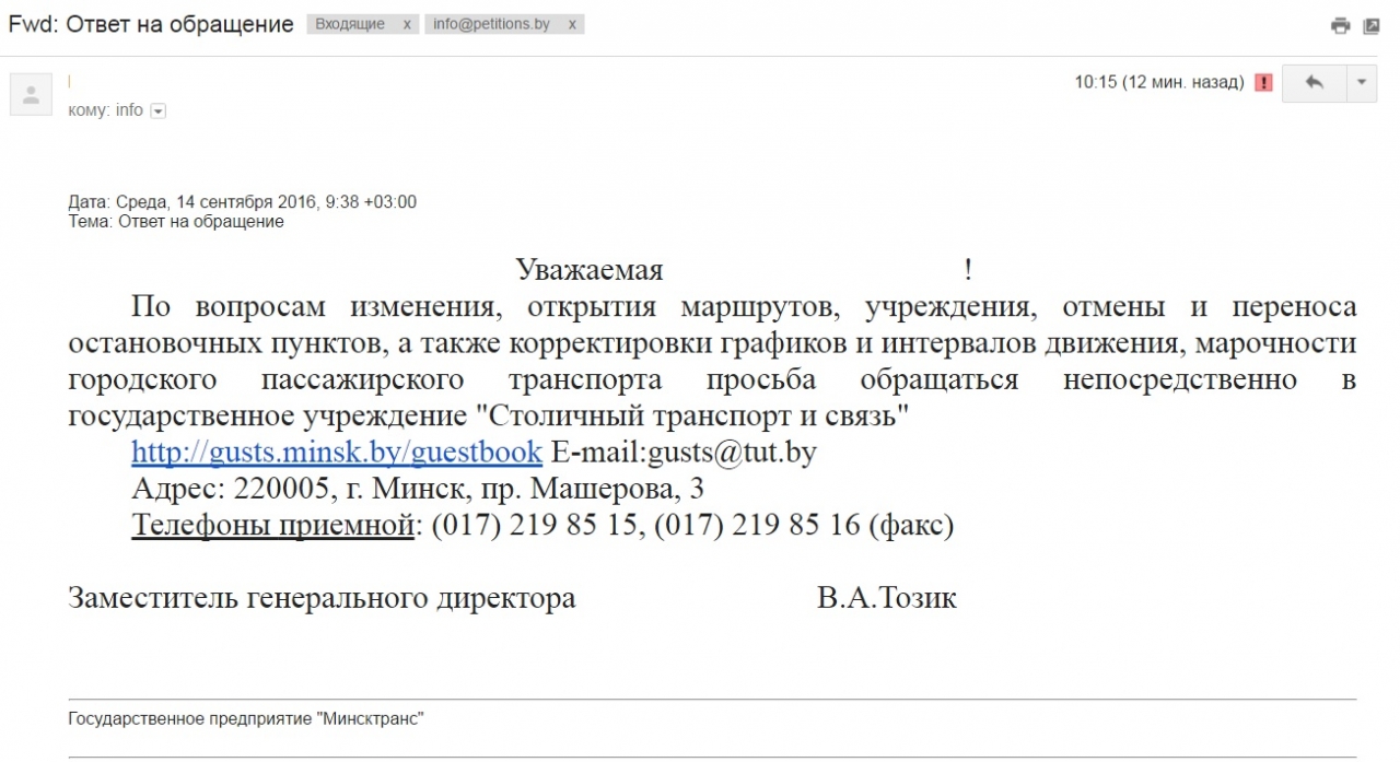 По вопросам изменения, открытия маршрутов, учреждения, отмены и переноса остановочных пунктов, а также корректировки графиков и интервалов движения, марочности городского пассажирского транспорта необходимо обращаться непосредственно в государственное учреждение "Столичный транспорт и связь".