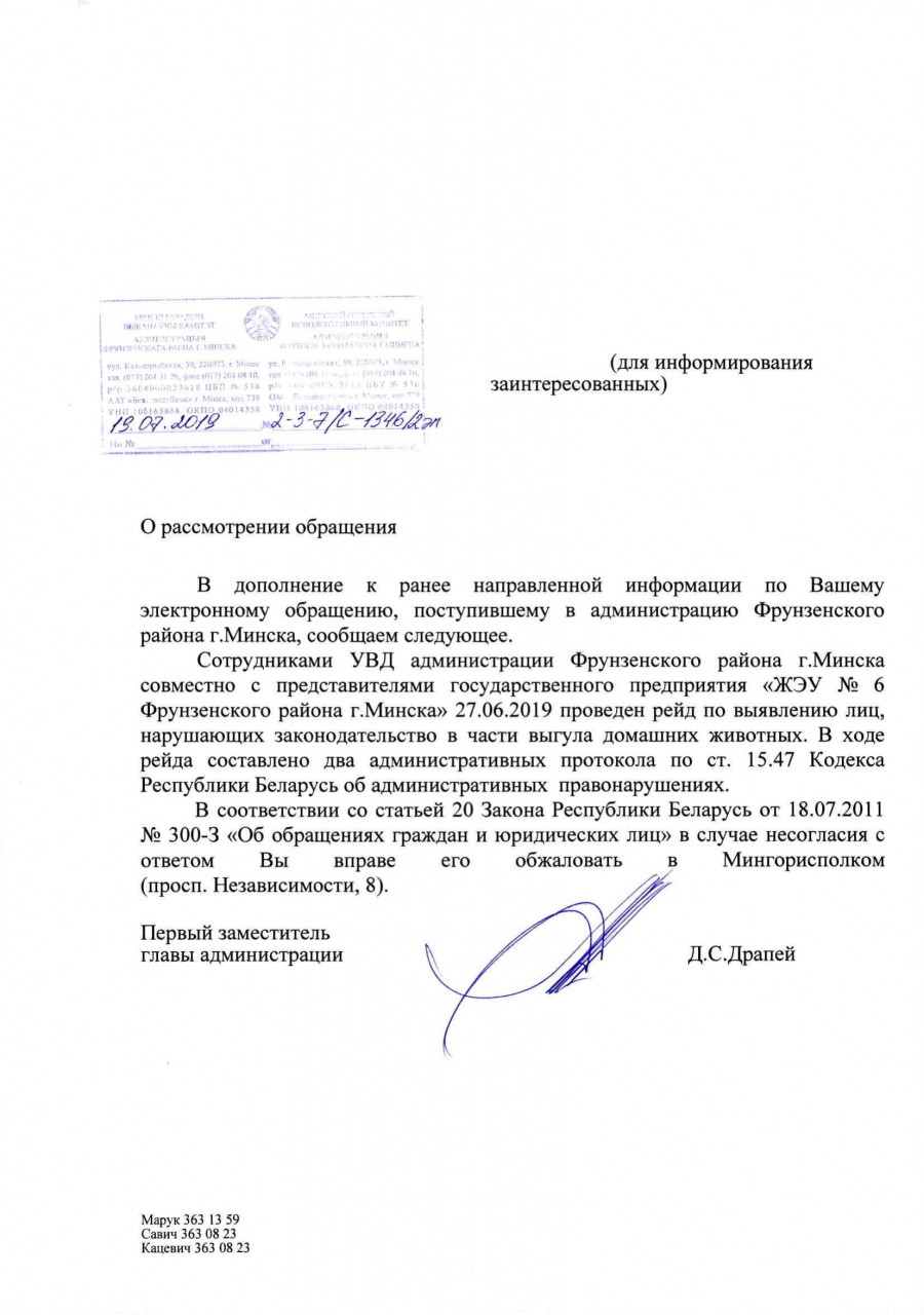 Ввиду вышеизложенного, требуем, в рамках компетенции усилить контроль за соблюдением владельцами собак Правил содержания домашних собак, утверждённых Постановлением Совмина от 04.06.2001 №834, в том числе в пределах улиц, расположенных между ст.метро "Каменная горка" и ст.метро " Кунцевщина", а также принимать меры по привлечению недобросовестных владельцев, нарушающих Правила, к ответственности, в том числе путём штрафования. Кроме того, предлагаем рассмотреть вопрос о создании большего количества площадок для выгула собак в рамках указанной выше территории. Считаем необходимым создание специальной службы по контролю за выгулом собак.