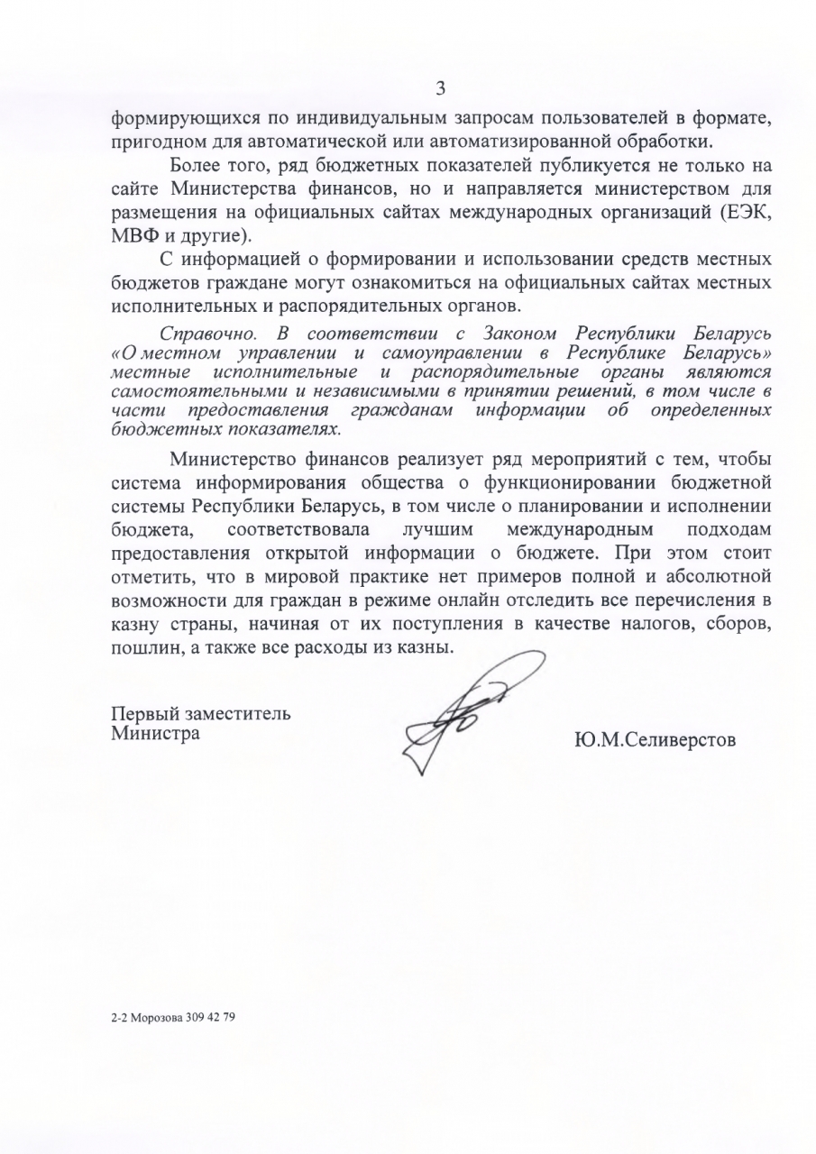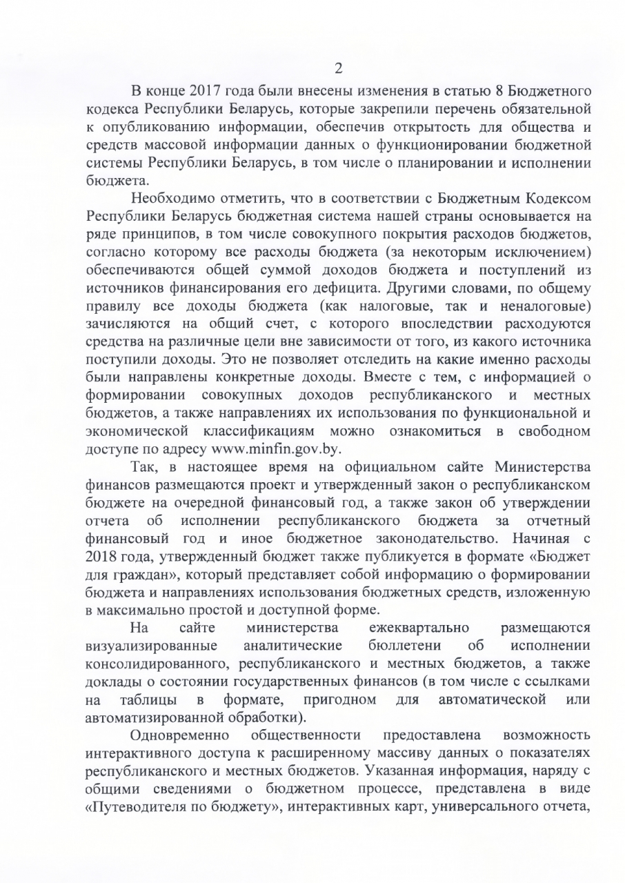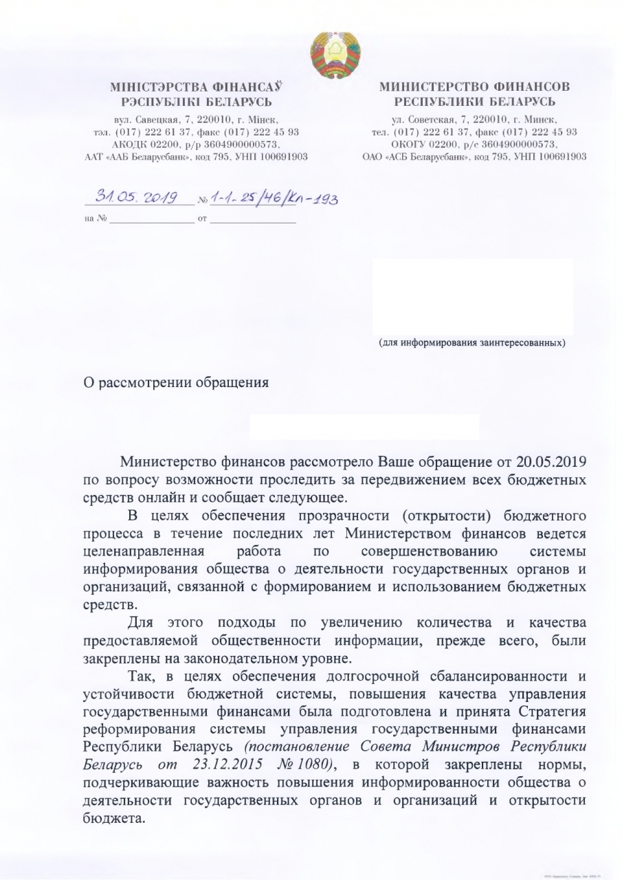 Просим рассмотреть вопрос о введении полной и абсолютной возможности отследить все денежные перечисления в казну Республики Беларусь, начиная от их поступления в казну, будь то в качестве налогов, сборов, пошлин, а также все расходы из казны, все передвижения денежных средств, вплоть до каждой копейки, чтобы каждый налогоплательщик был убеждён в том, что его деньги действительно не зря уплачены.