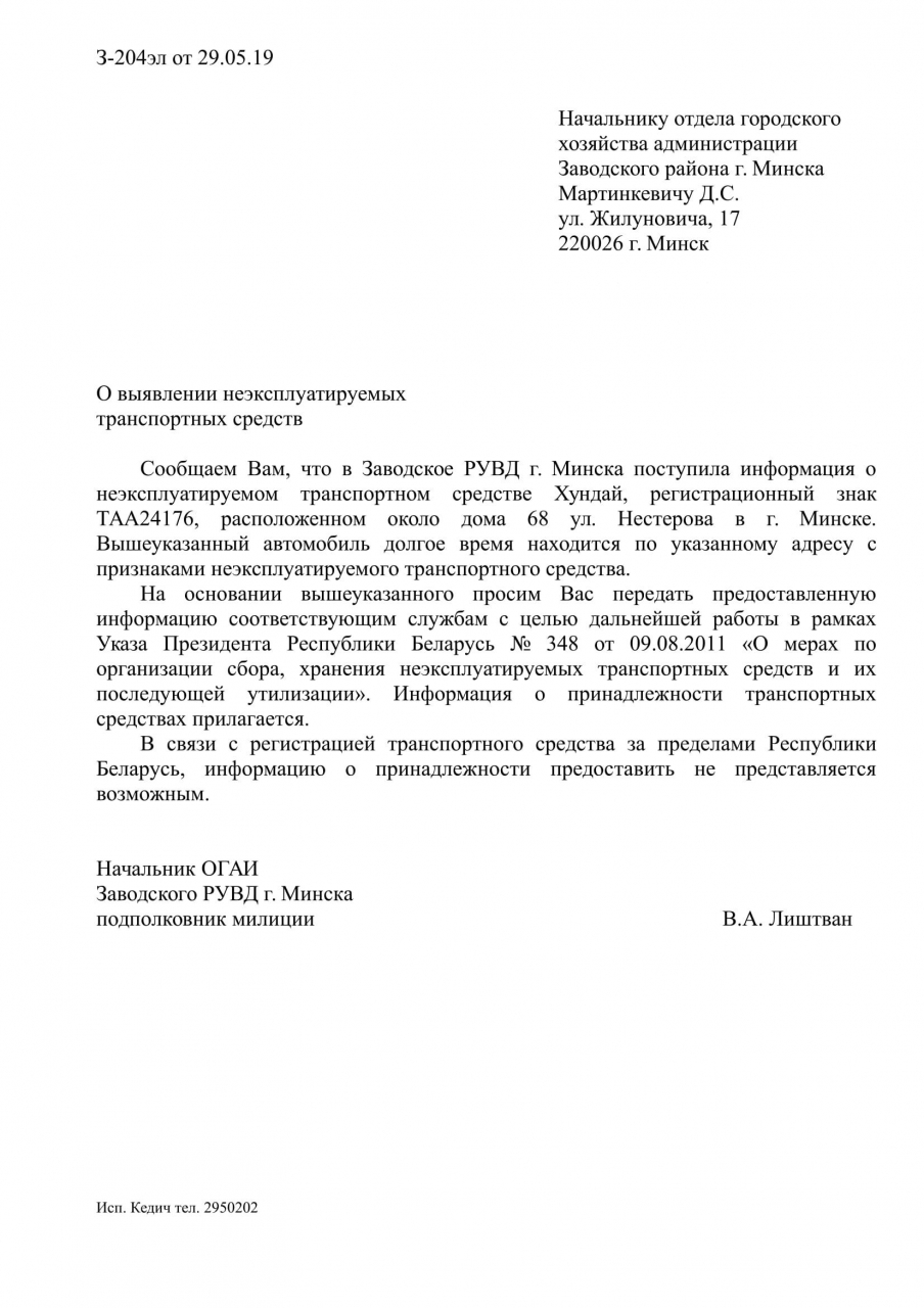 Предоставленная информация передана соответствующим службам с целью дальнейшей работы в рамках Указа Президента Республики Беларусь № 348 от 09.08.2011 «О мерах по организации сбора, хранения неэксплуатируемых транспортных средств и их последующей утилизации.