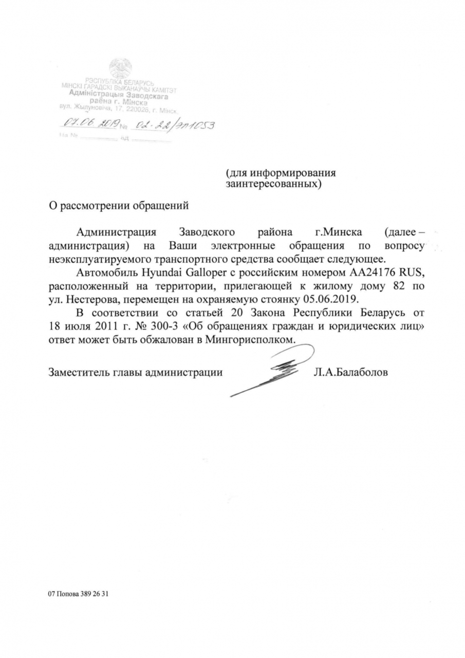 Таким образом, просим принять меры по эвакуации неэксплуатируемого автомобиля Hyundai Galloper (транзитный российский номер ТАА24176) либо на штрафстоянку, либо на ближайшую парковку
