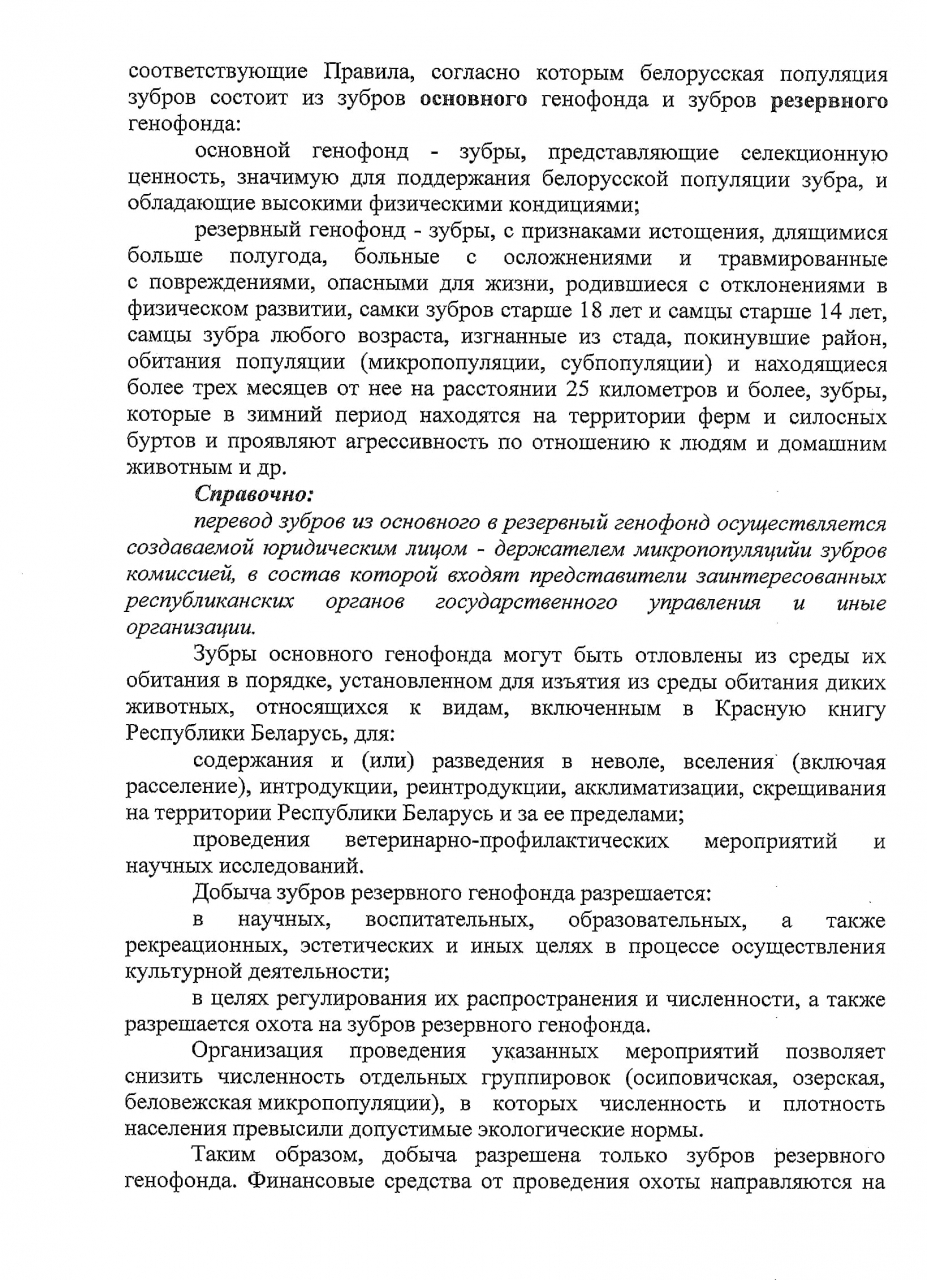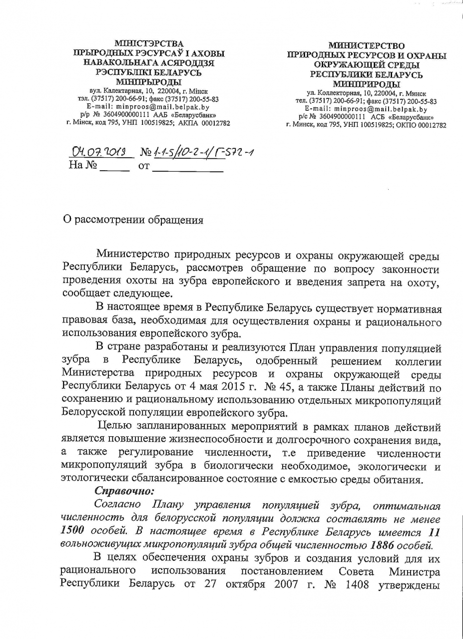 Таким образом, на основании изложенного просим провести проверку по вышеописанным обстоятельствам и принять меры по пресечению оказания услуг по охоте на зубров, а также ввести запрет на охоту на зубров в целом.