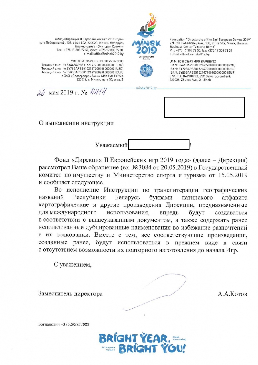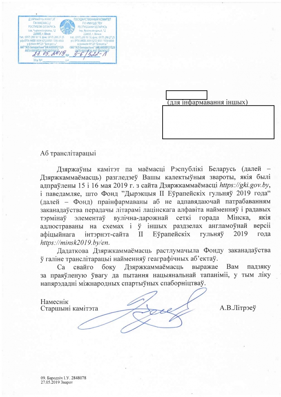 Фонд «Дырэкцыя II Еўрапейскіх гульняў 2019 года» праінфармаваны аб не адпавядаючай патрабаванням заканадаўства перадачы літарамі лацінскага алфавіта найменняў і радавых тэрмінаў элементаў вулічна-дарожнай сеткі горада Мінска, якія адлюстраваны на схемах і ў іншых раздзелах англамоўнай версіі афіцыйнага інтэрнэт-сайта II Еўрапейскіх гульняў 2019 года.