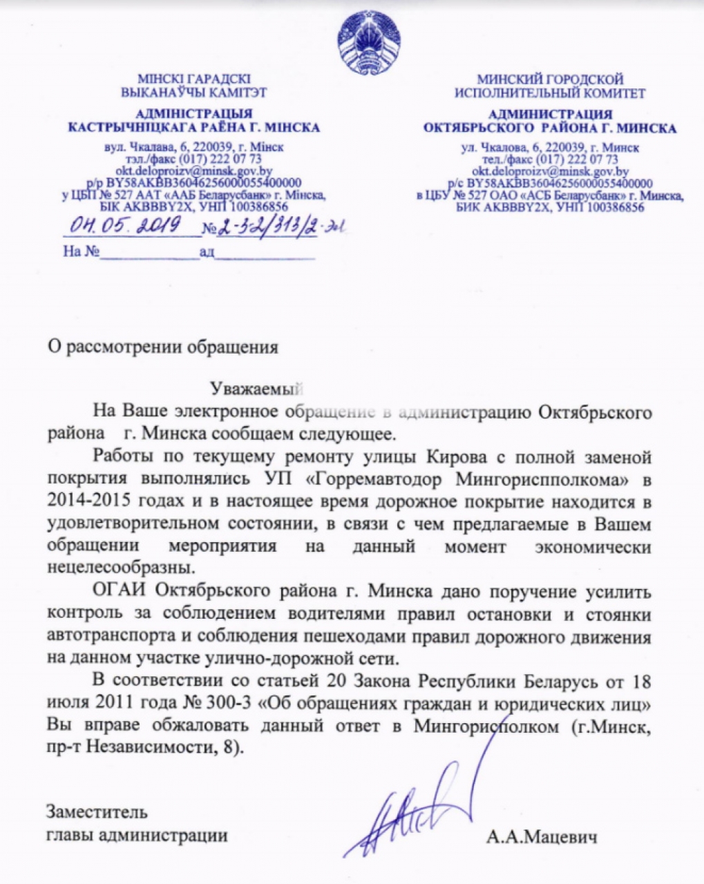04 мая 2019 мною получен ответ на электронное обращение (копия прилагается). Указанный ответ я считаю не соответствующим требованиям законодательства в части полного, всестороннего и объективного рассмотрения обращений и направления мотивированных и обоснованных ответов гражданам по следующим причинам: