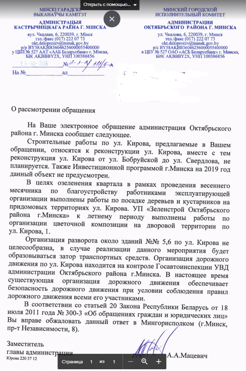 Также в обращении была просьба организовать разворот около Кирова 5 и 6, но ответа на эту просьбу не было. Данный разворот можно организовать при помощи изменения разметки и без необходимости изменять дорожное покрытие.