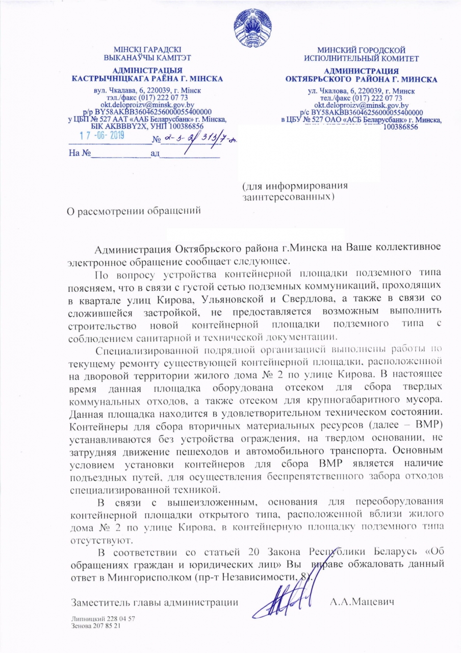 Администрация Октябрьского района г. Минска не уточнила по каким именно нормам нельзя установить мусорки в виде подземных контейнеров. Не было учтено, что расположение контейнеров можно изменить, чтобы не конфликтовать с подземными коммуникациями. При этом в Шабанах подземные мусорки нормы позволяют делать, а в центре города уже нет. Может пора пересмотреть эти нормы?
